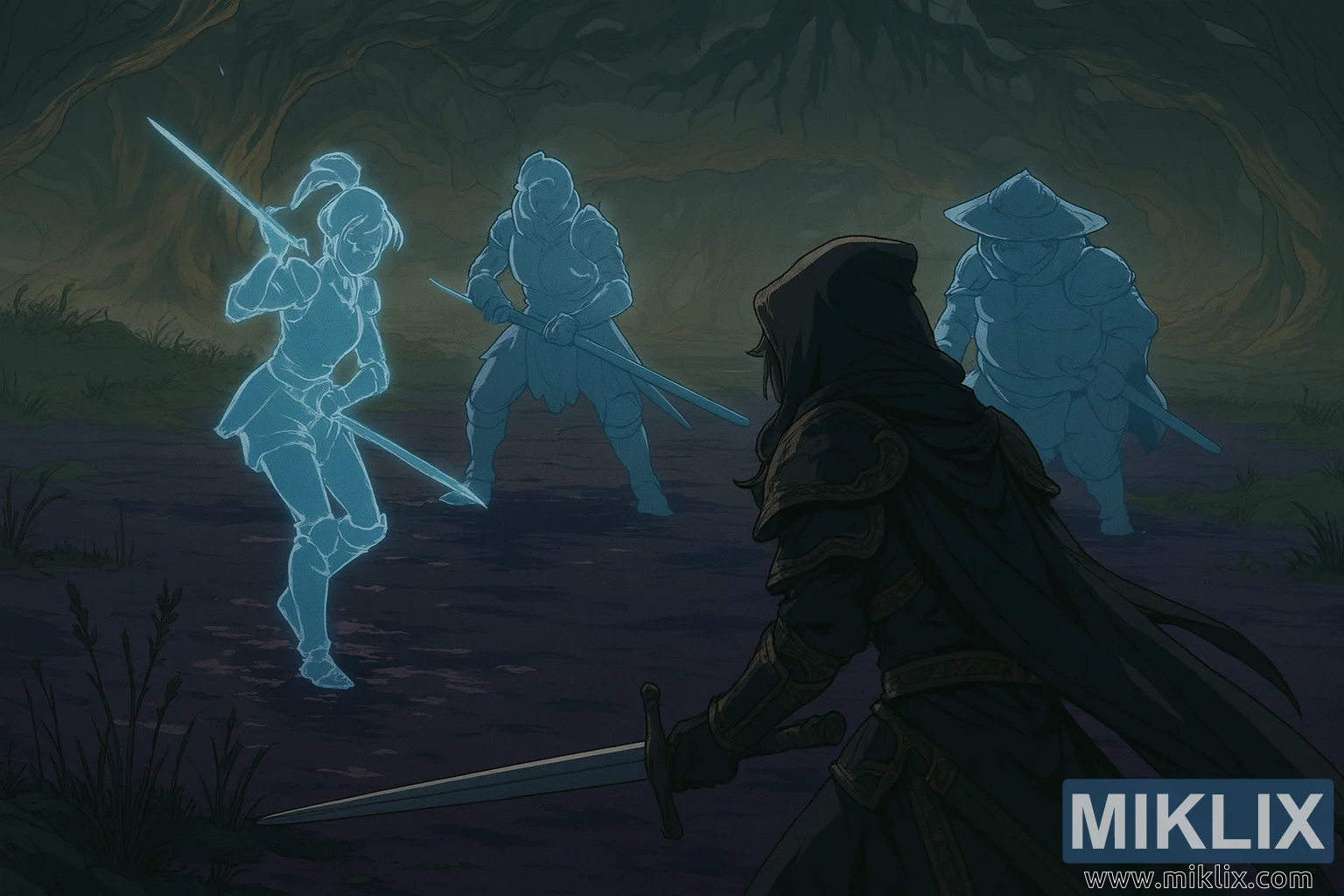 టార్నిష్డ్ను ఎదుర్కొంటూ ముగ్గురు స్పెక్ట్రల్ యోధులు ఫియాస్ ఛాంపియన్స్ అని పిలుస్తారు. ప్రతి ఒక్కరూ అపారదర్శక నీలిరంగు ప్రకాశంతో మెరుస్తున్నారు, వారి ఆకారాలు అర్ధ-పారదర్శకంగా మరియు అతీంద్రియంగా ఉంటాయి, ఇది వారి దెయ్యం స్వభావాన్ని సూచిస్తుంది. ఎడమ వైపున, ఒక మహిళా ఛాంపియన్ తన తలపైకి ఎత్తిన పొడవైన కత్తితో ముందుకు దూసుకుపోతుంది. ఆమె కవచం విభజించబడింది మరియు ఆకారంలో సరిపోతుంది, మరియు ఆమె జుట్టు గట్టి బన్నులో వెనుకకు కట్టి ఉంటుంది. ఆమె భంగిమ దూకుడుగా ఉంటుంది, ఒక అడుగు ముందుకు ఉంచి వికర్ణంగా కోణించబడి, ఆమె దాడి వేగాన్ని సంగ్రహిస్తుంది.