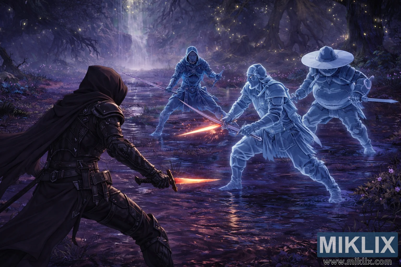 వాతావరణం ఘర్షణ తీవ్రతను పెంచుతుంది. నేలపై పలుచని నీటి పొర కప్పబడి ఉంటుంది, ఇది యోధులను, వారి ఆయుధాలను మరియు చుట్టుపక్కల కాంతిని ప్రతిబింబిస్తుంది, ప్రతి కదలికతో మెరిసే వక్రీకరణలను సృష్టిస్తుంది. వక్రీకృత, పురాతన వేర్లు నేల నుండి పైకి లేచి తలపైకి వంపుతిరిగి, యుద్ధాన్ని రూపొందించే సహజ పందిరిని ఏర్పరుస్తాయి. బయోలుమినిసెంట్ మొక్కలు మరియు పువ్వులు నీలం, ఊదా మరియు లేత బంగారు రంగులలో మృదువుగా మెరుస్తాయి, చీకటిని తొలగించకుండా ప్రకాశిస్తాయి. దూరంలో, ఒక ప్రకాశవంతమైన జలపాతం కాంతి తెరలా క్రిందికి జారుతుంది, కూర్పుకు లోతు మరియు నిలువు స్థాయిని జోడిస్తుంది.