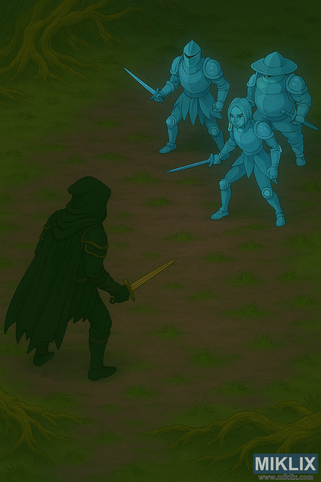 చిత్రం యొక్క దిగువ ఎడమ భాగంలో తరుగుదల చెందిన వ్యక్తి నిలబడి ఉన్నాడు, వెనుక నుండి పూర్తిగా కనిపిస్తుంది. అతను సొగసైన, అరిష్టమైన బ్లాక్ నైఫ్ కవచాన్ని ధరించి ఉన్నాడు, ఇది లేయర్డ్ బ్లాక్ ప్లేటింగ్, సూక్ష్మమైన బంగారు ట్రిమ్ మరియు కదలికతో అలలు ప్రవహించే వస్త్రంతో వర్గీకరించబడింది. అతని హుడ్ క్రిందికి లాగబడింది, చీకటిని గుచ్చుకునే రెండు మెరుస్తున్న ఎర్రటి కళ్ళు తప్ప అతని ముఖాన్ని అస్పష్టం చేస్తుంది. తరుగుదల చెందిన వ్యక్తి యొక్క వైఖరి వెడల్పుగా మరియు సమతుల్యంగా ఉంటుంది, మోకాలు వంగి ఉంటుంది మరియు తడిగా ఉన్న అటవీ నేలపై పాదాలు గట్టిగా నాటబడి ఉంటాయి. అతని ఎడమ చేతిలో, అతను తన శరీరం అంతటా రక్షణాత్మకంగా కోణంలో బంగారు బ్లేడుతో కూడిన కత్తిని పట్టుకుంటాడు, అతని కుడి చేయి దాడికి సిద్ధంగా ఉన్న పొడవైన కత్తిని పట్టుకుంటుంది.