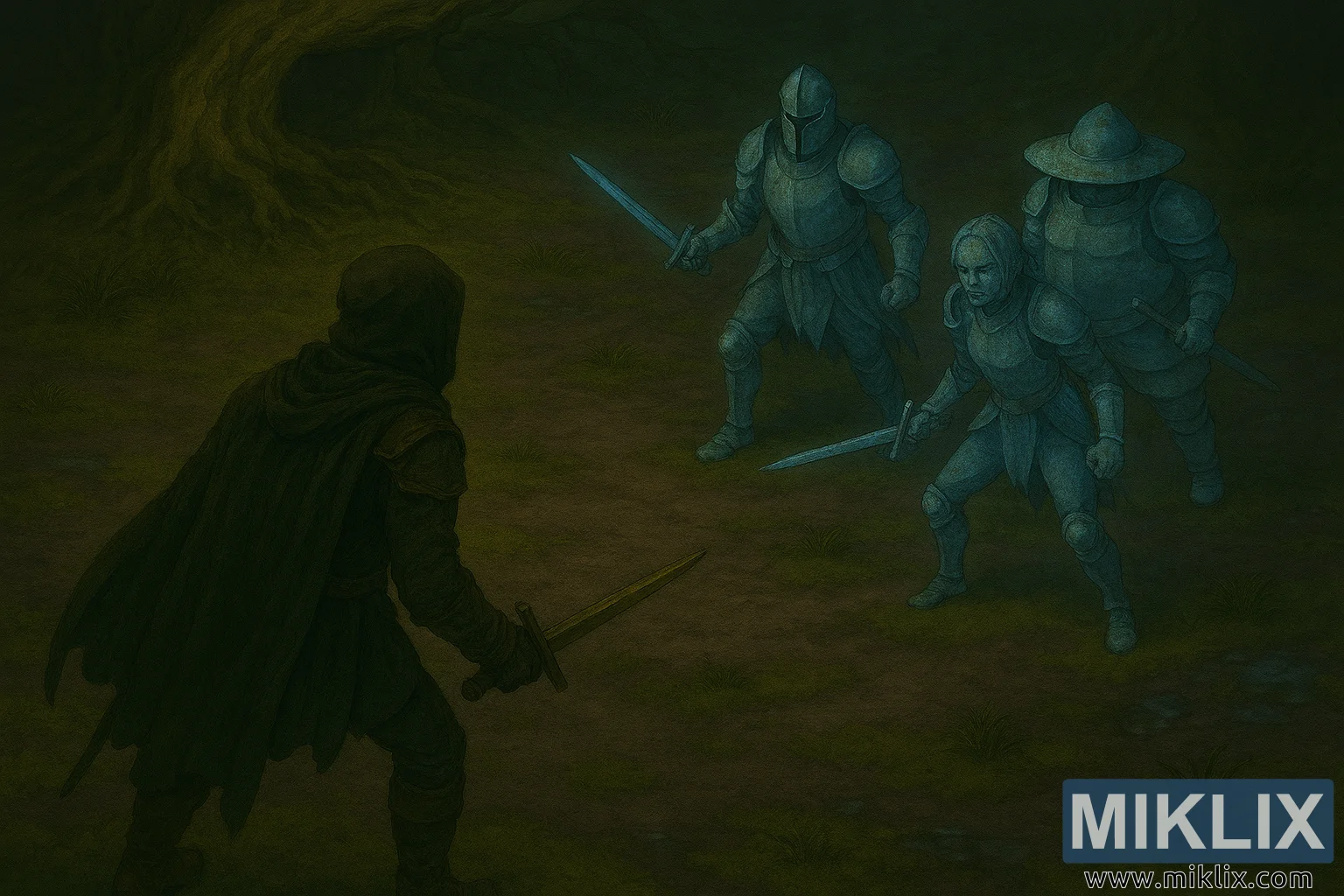 అతనికి ఎదురుగా, ఎగువ కుడి క్వాడ్రంట్లో, ఫియాస్ ఛాంపియన్స్ అని పిలువబడే ముగ్గురు దెయ్యం లాంటి నీలి యోధులు నిలబడి ఉన్నారు. వారి అపారదర్శక రూపాలు అటవీ నేల యొక్క మ్యూట్ చేయబడిన ఆకుపచ్చ, ఊదా మరియు గోధుమ రంగులతో తీవ్రంగా విభేదించే మృదువైన, అతీంద్రియ కాంతిని ప్రసరింపజేస్తాయి. సెంట్రల్ ఛాంపియన్ పూర్తి హెల్మెట్ మరియు పొడవైన కేప్తో భారీగా సాయుధ గుర్రం, రెండు చేతుల్లో మెరుస్తున్న కత్తిని పట్టుకున్నాడు. అతని వైఖరి దృఢంగా మరియు ఆజ్ఞాపించేదిగా ఉంటుంది, శత్రువు నిర్మాణాన్ని లంగరు వేస్తుంది. అతని ఎడమ వైపున, తేలికైన కవచంలో ఉన్న ఒక మహిళా యోధుడు దూకుడుగా ఉన్న వైఖరిలో వంగి ఉంటుంది, ఆమె కత్తి క్రిందికి పట్టుకుని కొట్టడానికి సిద్ధంగా ఉంది. ఆమె కవచం సొగసైనది మరియు అమర్చబడింది, మరియు ఆమె చిన్న జుట్టు ఆమె దృఢమైన వ్యక్తీకరణను ఫ్రేమ్ చేస్తుంది. కుడి చివరన వెడల్పాటి అంచుగల శంఖాకార టోపీ మరియు గుండ్రని కవచం ధరించిన గుండ్రని యోధుడు నిలబడి ఉన్నాడు. అతను రెండు చేతులతో కోసిన కత్తిని పట్టుకున్నాడు, అతని భంగిమ జాగ్రత్తగా ఉన్నప్పటికీ దృఢంగా ఉంటుంది.