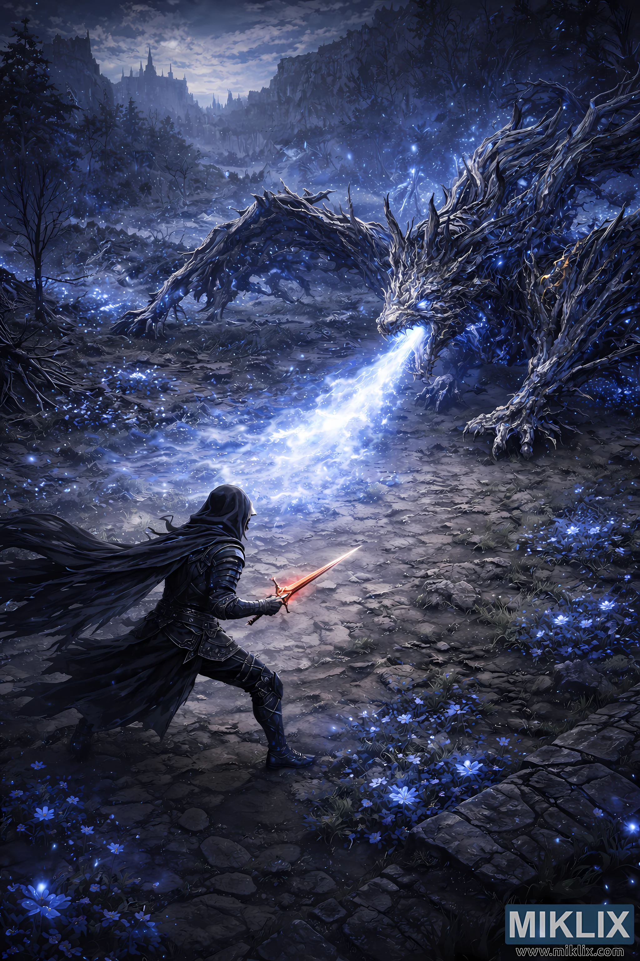 పగిలిన రాతి రోడ్డు ఆ నిర్మాణం అంతటా వికర్ణంగా తిరుగుతుంది, దాని విరిగిన పలకలు పోరాట యోధుల మధ్య సహజ మార్గాన్ని ఏర్పరుస్తాయి. రహదారి అంచుల వెంబడి చిన్న, ప్రకాశవంతమైన నీలిరంగు పువ్వుల సమూహాలు పెరుగుతాయి, వాటి మృదువైన కాంతి డ్రాగన్ యొక్క దెయ్యం జ్వాలను ప్రతిధ్వనిస్తుంది మరియు నేల అంతటా కాంతి మచ్చలను వెదజల్లుతుంది. రాళ్లపై పొగమంచు వంపులు తిరుగుతూ, భూమి కూడా వెంటాడుతుందనే అభిప్రాయాన్ని ఇస్తుంది.