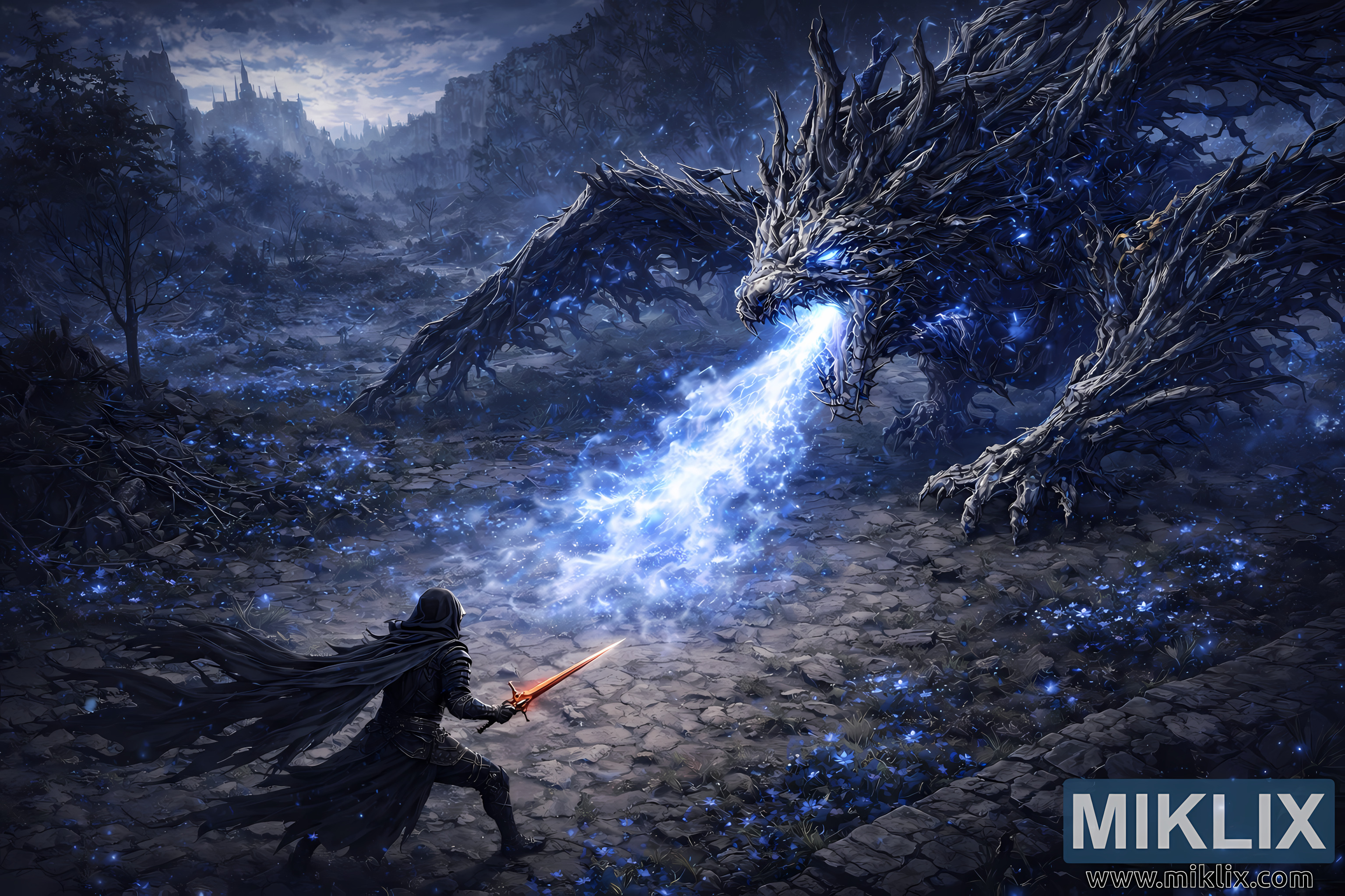 హైవేకి ఎదురుగా దెయ్యాల మంట డ్రాగన్ ఆధిపత్యం చెలాయిస్తుంది, ఇది భారీ స్థాయిలో కనిపిస్తుంది. దాని శరీరం ఫ్రేమ్ యొక్క దాదాపు మొత్తం కుడి అర్ధభాగాన్ని నింపుతుంది, శిలారూపమైన కలప, ఎముక మరియు నల్లబడిన సైన్ యొక్క వికారమైన చిక్కు. రెక్కలు చనిపోయిన అడవి పందిరిలాగా బయటికి వంగి, మేఘావృతమైన రాత్రి ఆకాశానికి వ్యతిరేకంగా బెల్లం ఛాయాచిత్రాలను వేస్తాయి. దాని కళ్ళు చుక్కల కోపంతో మండుతాయి మరియు దాని తెరిచిన దవడల నుండి దెయ్యాల మంట యొక్క భారీ ప్రవాహం ప్రవహిస్తుంది, ప్రకాశవంతమైన నీలిరంగు అగ్ని నది, ఇది తరుగుదల వైపు రహదారి మీదుగా ప్రవహిస్తుంది. పేలుడు చాలా ప్రకాశవంతంగా ఉంటుంది, ఇది రాళ్లను మెరిసే అద్దాలుగా మారుస్తుంది మరియు చుట్టుపక్కల పొగమంచును చల్లని కాంతితో నింపుతుంది.