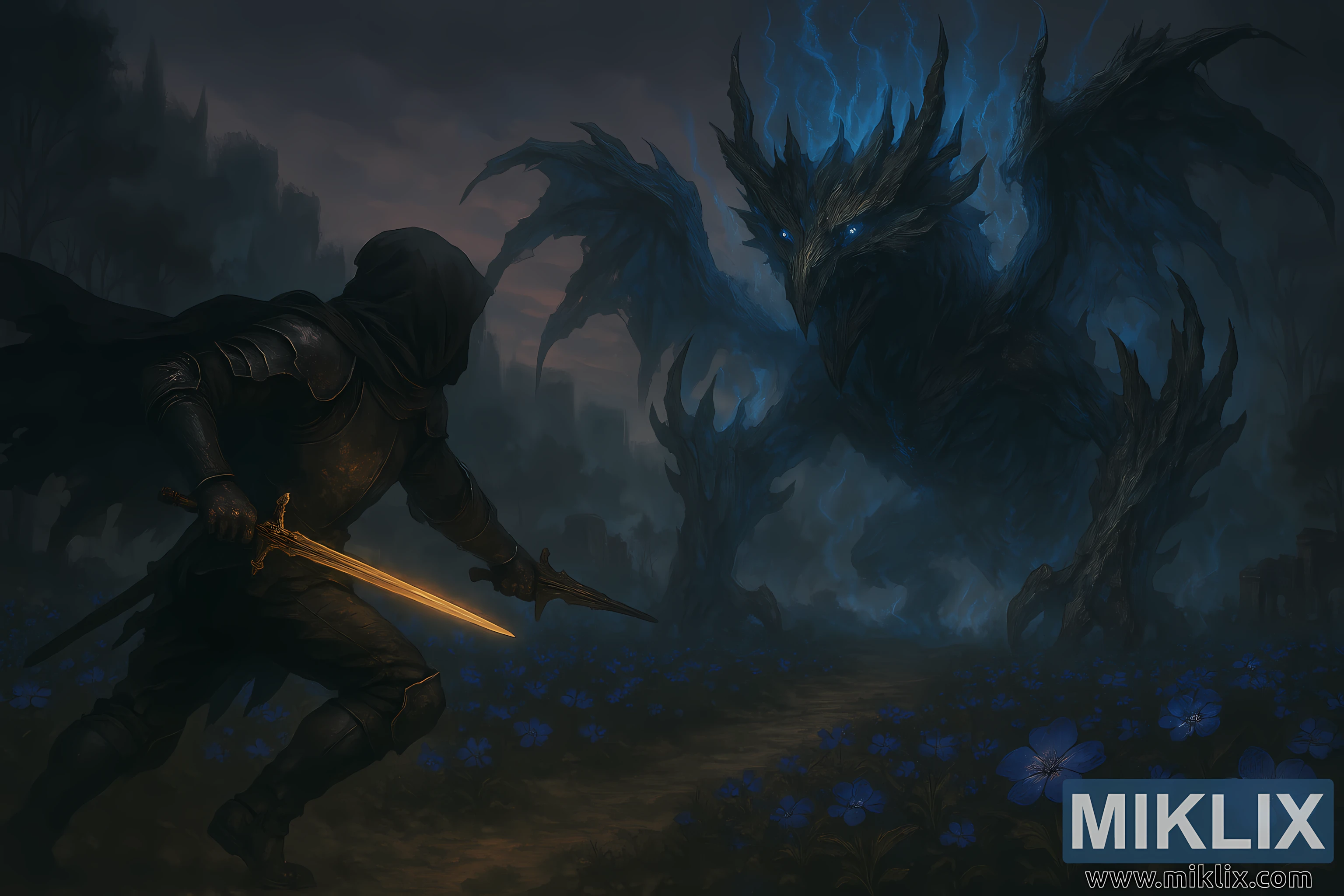యుద్ధానికి సిద్ధంగా ఉన్న స్థితిలో, మోకాళ్లను వంచి, బరువును కుడి కాలుపైకి మార్చి, తర్నిష్డ్ ముందుకు దూసుకుపోతుంది. ప్రతి చేతిలో, వారు వెచ్చని, ప్రకాశవంతమైన కాంతిని విడుదల చేసే బంగారు కత్తులను పట్టుకుంటారు. ఎడమ కత్తు పైకి కోణంలో ఉంటుంది, అయితే కుడి కత్తు డ్రాగన్ వైపు విస్తరించి, యోధుడి కవచం మరియు చుట్టుపక్కల భూభాగంపై కాంతిని ప్రసరింపజేస్తుంది. ఈ భంగిమ ఉద్రిక్తత, సంసిద్ధత మరియు సంకల్పాన్ని తెలియజేస్తుంది.