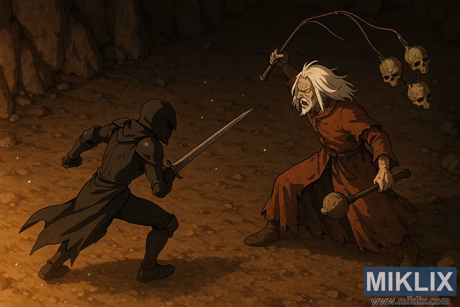 ఎదురుగా, కుడి వైపున, నెక్రోమాన్సర్ గారిస్ ఉన్నాడు, అతను చిరిగిన, తుప్పు పట్టిన ఎరుపు రంగు దుస్తులు ధరించిన వృద్ధ, బొద్దుగా ఉండే మాంత్రికుడిగా చిత్రీకరించబడ్డాడు. అతని పొడవాటి తెల్లటి జుట్టు ఆకస్మిక కదలికతో కదిలినట్లుగా బయటికి మెరుస్తుంది, కోపంతో వక్రీకృతమైన ముఖాన్ని తయారు చేస్తుంది. లోతైన ముడతలు, మునిగిపోయిన బుగ్గలు మరియు గుర్రుమనే నోరు వయస్సు మరియు క్రూరత్వాన్ని రెండింటినీ తెలియజేస్తాయి. గారిస్ భంగిమ దూకుడుగా మరియు అసమతుల్యతతో ఉంటుంది, అతను ఘర్షణలోకి దూసుకుపోతున్నప్పుడు ఒక అడుగు ముందుకు ఉంచాడు.