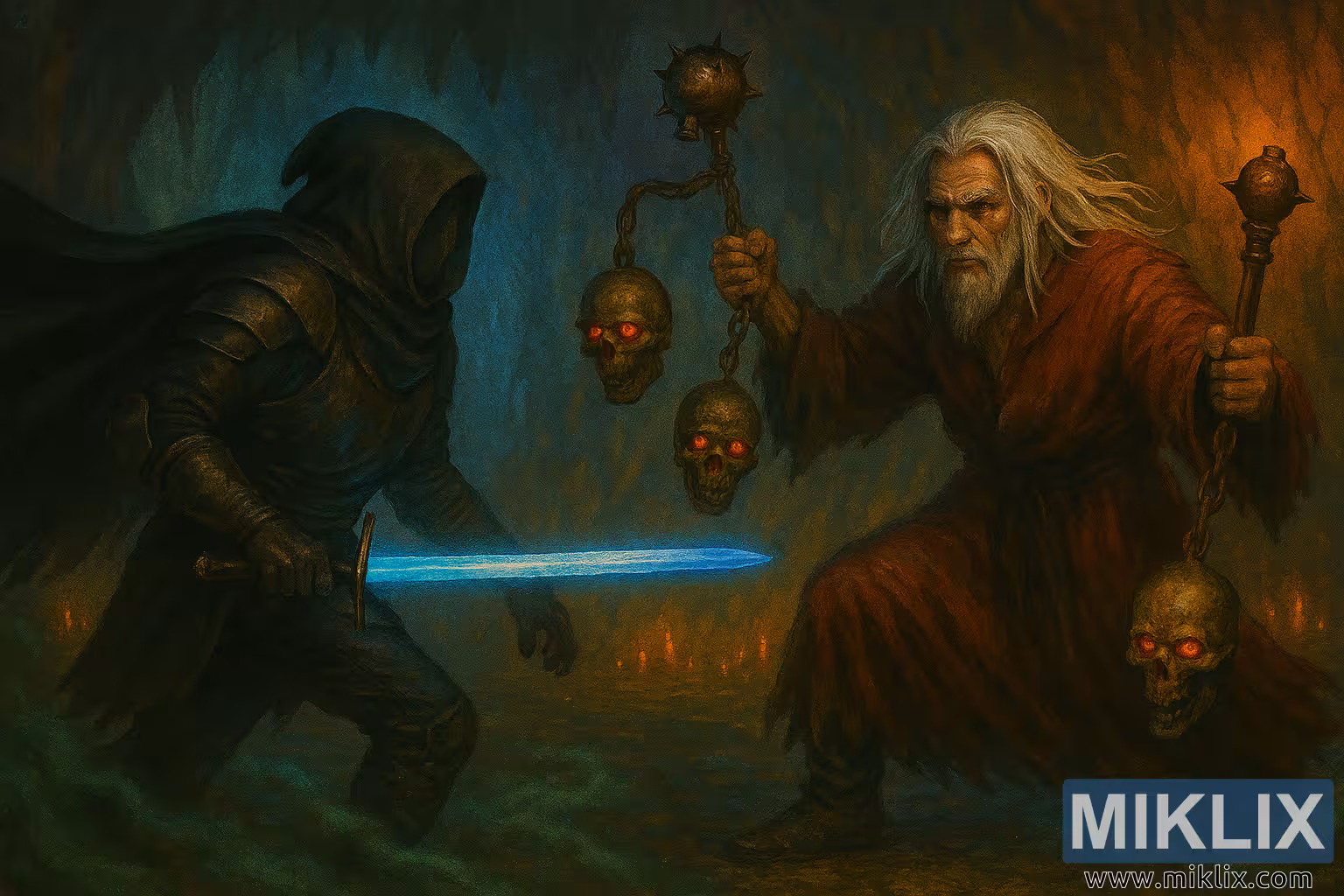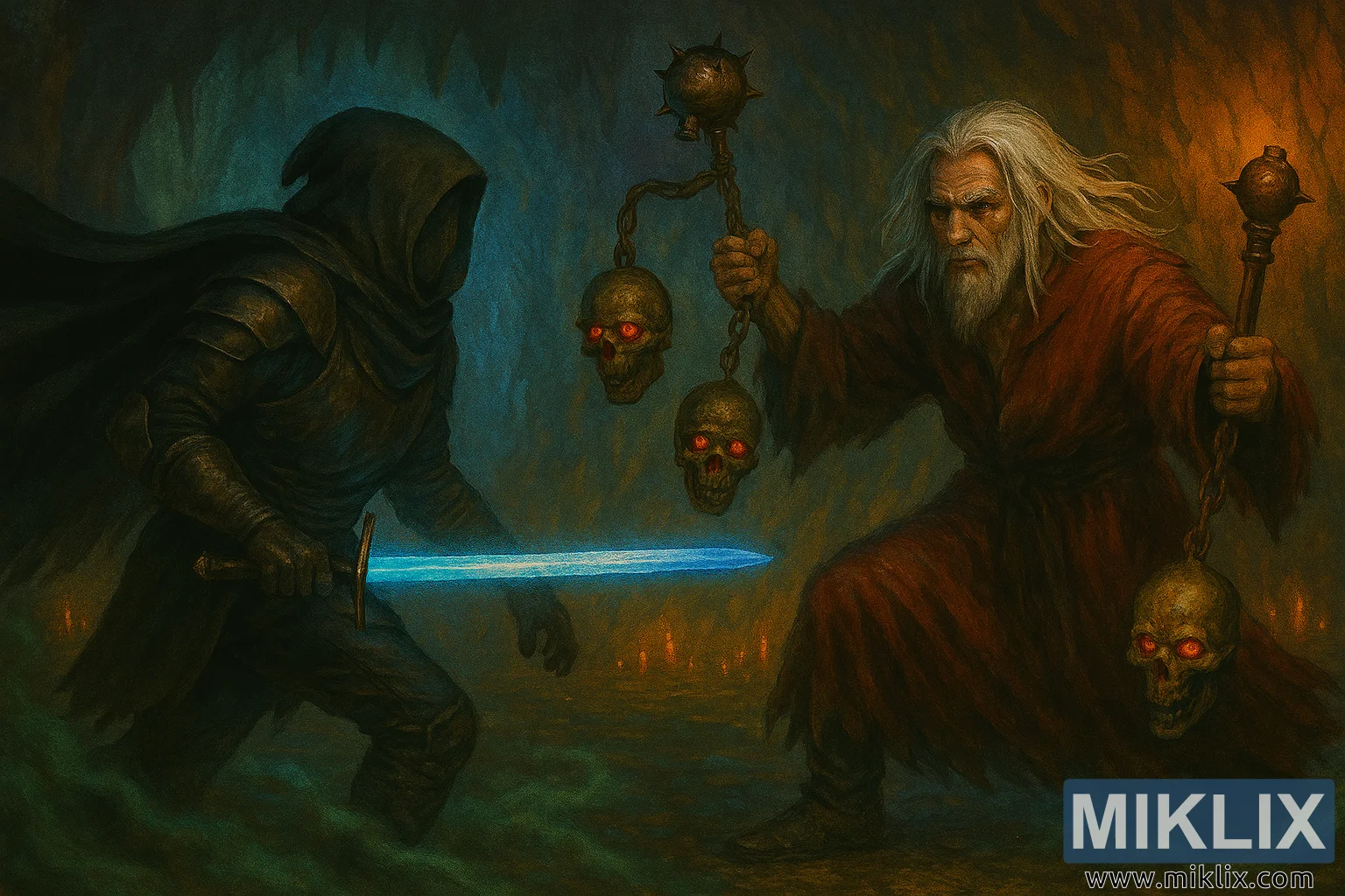 ఈ అర్ధ-వాస్తవిక ఫాంటసీ కళాకృతి ఎల్డెన్ రింగ్లోని వెంటాడే చెరసాల అయిన సేజ్ కేవ్ లోపల టార్నిష్డ్ మరియు నెక్రోమాన్సర్ గారిస్ మధ్య నాటకీయ ఘర్షణను చిత్రీకరిస్తుంది. ఈ కూర్పు గ్రౌన్దేడ్ అనాటమీ, పెయింటర్ టెక్స్చర్స్ మరియు సినిమాటిక్ లైటింగ్ను నొక్కి చెబుతుంది, వీక్షకుడిని ఉద్రిక్తమైన మరియు ఆధ్యాత్మిక యుద్ధంలో ముంచెత్తుతుంది.