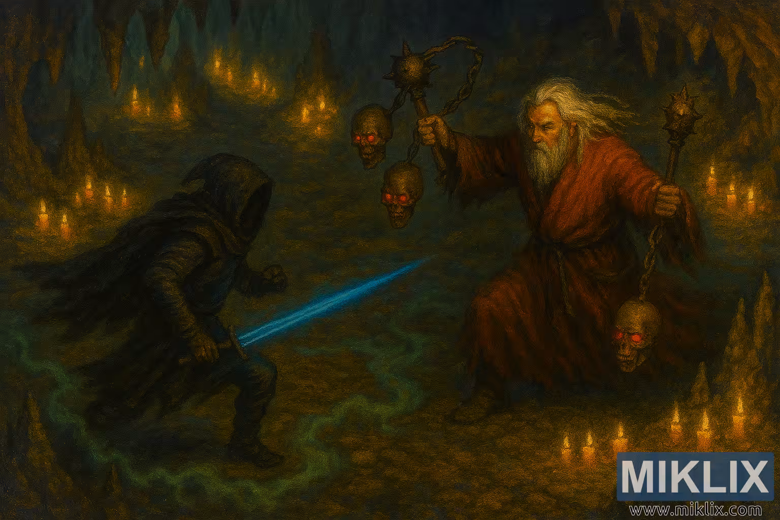 ఈ సెమీ-రియలిస్టిక్ ఫాంటసీ ఆర్ట్వర్క్, ఎల్డెన్ రింగ్లోని వెంటాడే చెరసాల అయిన సేజ్ కేవ్ లోపల టార్నిష్డ్ మరియు నెక్రోమాన్సర్ గారిస్ మధ్య జరిగే నాటకీయ యుద్ధం యొక్క ఉన్నతమైన, ఐసోమెట్రిక్ వీక్షణను అందిస్తుంది. ఈ కూర్పు గ్రౌన్దేడ్ అనాటమీ, పెయింటర్ టెక్స్చర్స్ మరియు సినిమాటిక్ లైటింగ్ను నొక్కి చెబుతుంది, వ్యూహాత్మక మరియు లీనమయ్యే దృక్పథాన్ని అందిస్తుంది.