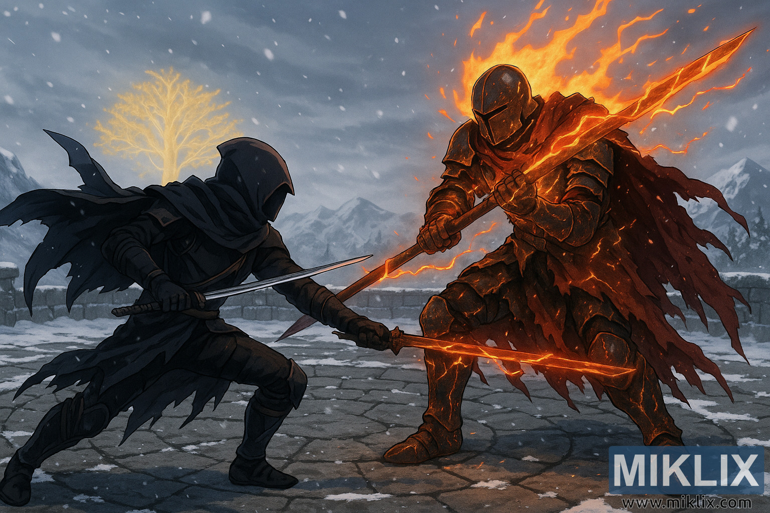 మంచుతో కూడిన లార్డ్ కంటెండర్ యొక్క ఎవర్గాల్ మధ్య రెండు చేతులతో తన మండుతున్న ఈటెను పట్టుకున్న రౌండ్ టేబుల్ నైట్ వైక్తో పోరాడుతున్న బ్లాక్ నైఫ్ యోధుడు యొక్క అనిమే-శైలి యుద్ధ దృశ్యం.
