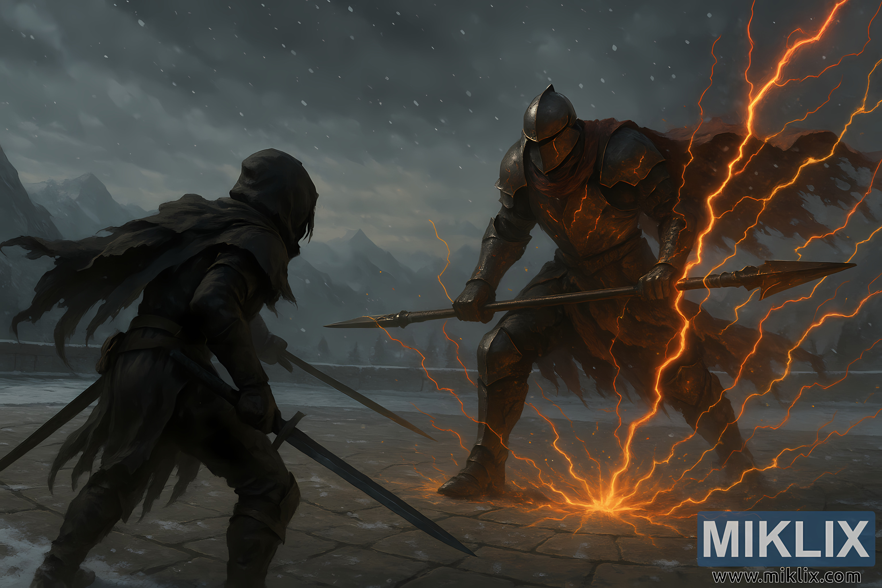 మంచుతో కూడిన లార్డ్ కాంటెండర్ యొక్క ఎవర్గాల్లో తన రెండు చేతుల ఈటె ద్వారా ఎరుపు మరియు పసుపు రంగు ఫ్రెంజిడ్ ఫ్లేమ్ మెరుపులను ప్రసారం చేసే రౌండ్ టేబుల్ నైట్ వైక్తో పోరాడుతున్న బ్లాక్ నైఫ్ యోధుడిని వర్ణించే వాస్తవిక డార్క్-ఫాంటసీ దృశ్యం.