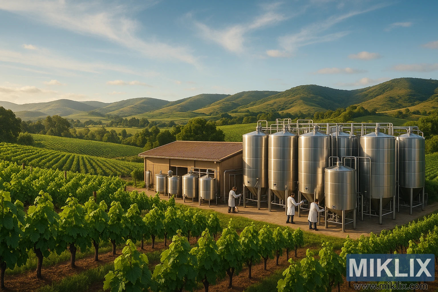 చిత్రం: ద్రాక్షతోట మరియు ఆధునిక కిణ్వ ప్రక్రియ సౌకర్యం