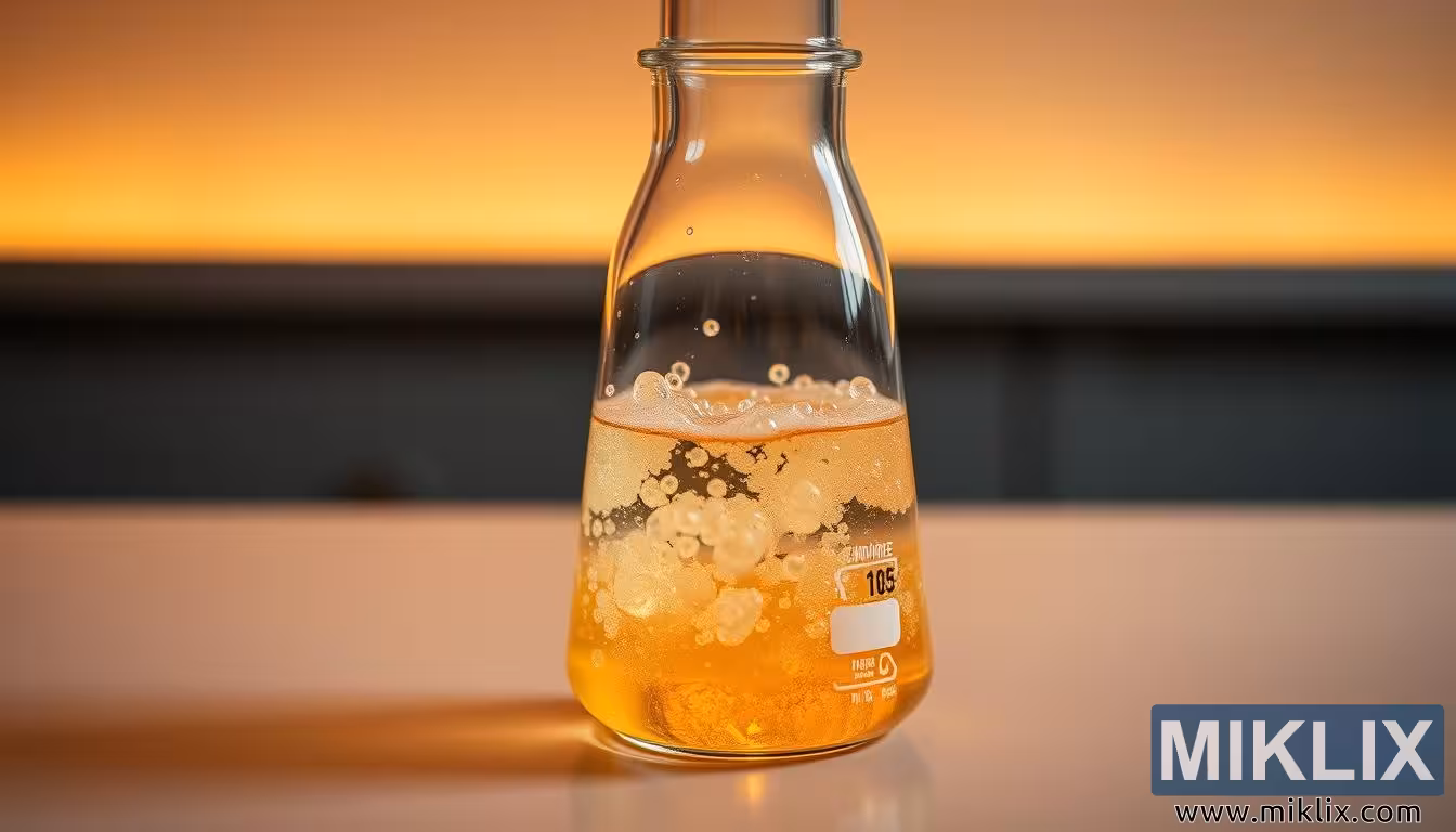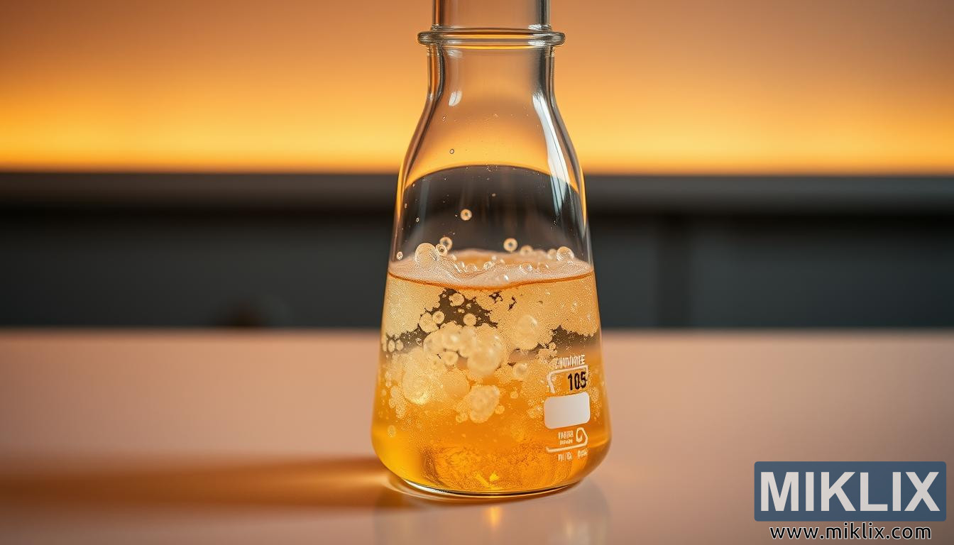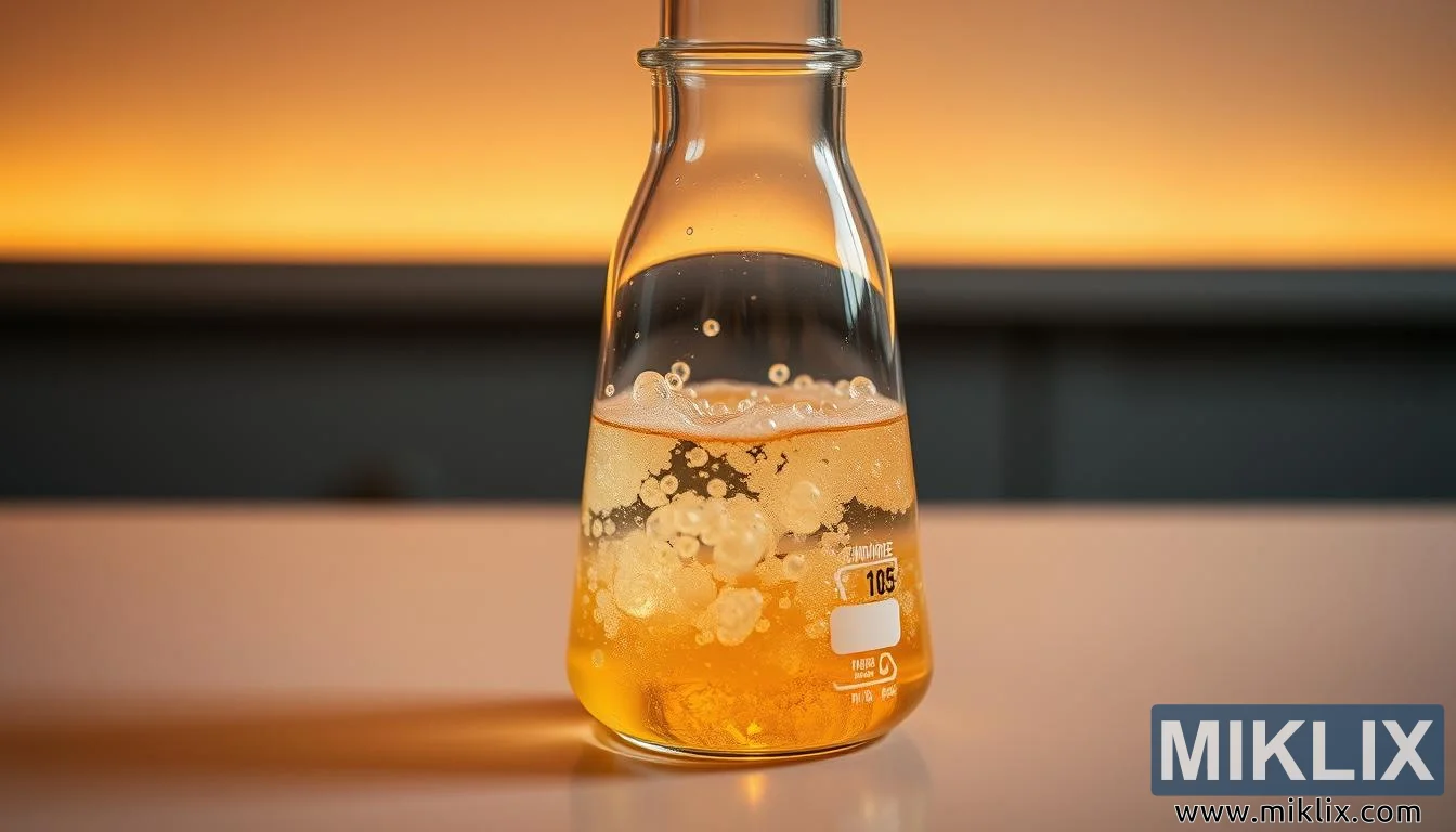 ఈ చిత్రం నియంత్రిత ప్రయోగశాల అమరికలో ఒక శక్తివంతమైన జీవసంబంధ కార్యకలాపాల క్షణాన్ని సంగ్రహిస్తుంది, ఇక్కడ కిణ్వ ప్రక్రియ యొక్క అదృశ్య యాంత్రిక విధానాలు శాస్త్రీయ పరిశీలన మరియు సౌందర్య కూర్పు యొక్క లెన్స్ ద్వారా కనిపిస్తాయి. దృశ్యం మధ్యలో పారదర్శకమైన ఎర్లెన్మేయర్ ఫ్లాస్క్ ఉంది, దాని శంఖాకార ఆకారం బంగారు-పసుపు ద్రవంతో నిండి ఉంటుంది, ఇది స్పష్టమైన శక్తితో బుడగలు మరియు మండిపోతుంది. ద్రవంలో సస్పెండ్ చేయబడిన తెల్లటి గ్లోబుల్స్ - బహుశా ఎమల్సిఫైడ్ బిందువులు లేదా ఈస్ట్ కాలనీలు - ప్రతి ఒక్కటి విషయాలను యానిమేట్ చేసే తిరుగుతున్న కదలికకు దోహదం చేస్తాయి. సున్నితమైన ప్రవాహాలలో బుడగలు పైకి లేచి, పైభాగంలో నురుగు పొరను ఏర్పరుస్తూ, ఉద్గారం సజీవంగా మరియు నిరంతరంగా ఉంటుంది, సున్నితమైన ప్రవాహాలలో బుడగలు పైకి లేచి, పైభాగంలో నురుగు పొరను ఏర్పరుస్తుంది, ఇది కిణ్వ ప్రక్రియ ప్రక్రియ యొక్క జీవక్రియ శక్తిని సూచిస్తుంది.