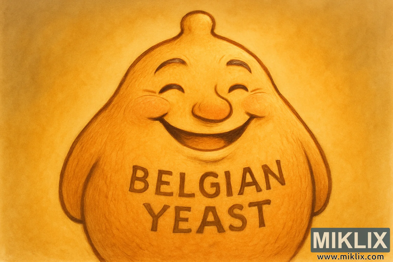 ఈ చిత్రం బెల్జియన్ ఈస్ట్ తయారీ యొక్క ఉత్సాహభరితమైన స్ఫూర్తిని ప్రతిబింబించే విచిత్రమైన, మానవరూప పాత్రను వర్ణిస్తుంది. బంగారు అంబర్ మరియు మృదువైన షేడింగ్తో వెచ్చని, చేతితో గీసిన సౌందర్యంలో అందించబడిన ఈ పాత్ర, ఈస్ట్ కణాన్ని గుర్తుకు తెచ్చే గుండ్రని, దాదాపు పియర్ లాంటి రూపాన్ని సంతరించుకుంటుంది, కానీ వెచ్చదనం మరియు పరిచయాన్ని ఆహ్వానించే స్పష్టమైన మానవ లక్షణాలతో ఉంటుంది.