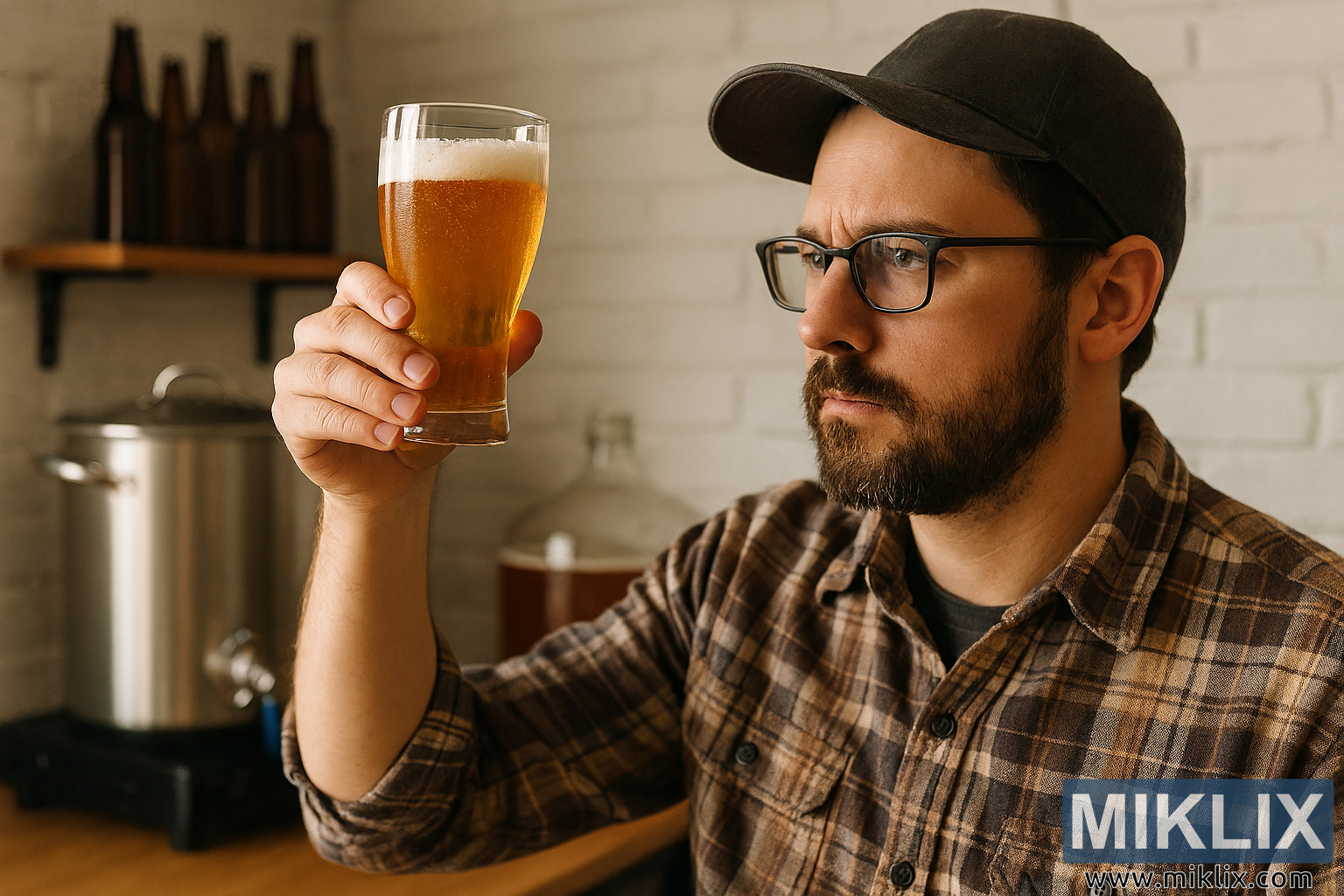 ఈ హై-రిజల్యూషన్ ల్యాండ్స్కేప్ ఫోటోగ్రాఫ్లో, ఒక హోమ్బ్రూవర్ కాలిఫోర్నియా లాగర్-స్టైల్ బీర్ గ్లాసును కాంతి వరకు పట్టుకుని కేంద్రీకృత తనిఖీలో బంధించబడ్డాడు. 30 ఏళ్ల ప్రారంభంలో ఉన్నట్లు కనిపించే ఆ వ్యక్తి చక్కగా కత్తిరించిన ముదురు గోధుమ రంగు గడ్డం కలిగి ఉన్నాడు మరియు దీర్ఘచతురస్రాకార నల్ల-ఫ్రేమ్డ్ అద్దాలు ధరించాడు. అతని వ్యక్తీకరణ ఏకాగ్రతతో ఉంటుంది, కొద్దిగా ముడుతలున్న కనుబొమ్మలు మరియు కళ్ళు బీర్ యొక్క స్పష్టత మరియు రంగుపై స్థిరంగా ఉంటాయి. అతను ముదురు బూడిద రంగు బేస్ బాల్ క్యాప్ మరియు గోధుమ, లేత గోధుమరంగు మరియు తెలుపు మట్టి టోన్లలో ప్లాయిడ్ ఫ్లాన్నెల్ చొక్కా ధరించి, బొగ్గు బూడిద రంగు అండర్ షర్ట్ మీద పొరలుగా వేయబడ్డాడు.