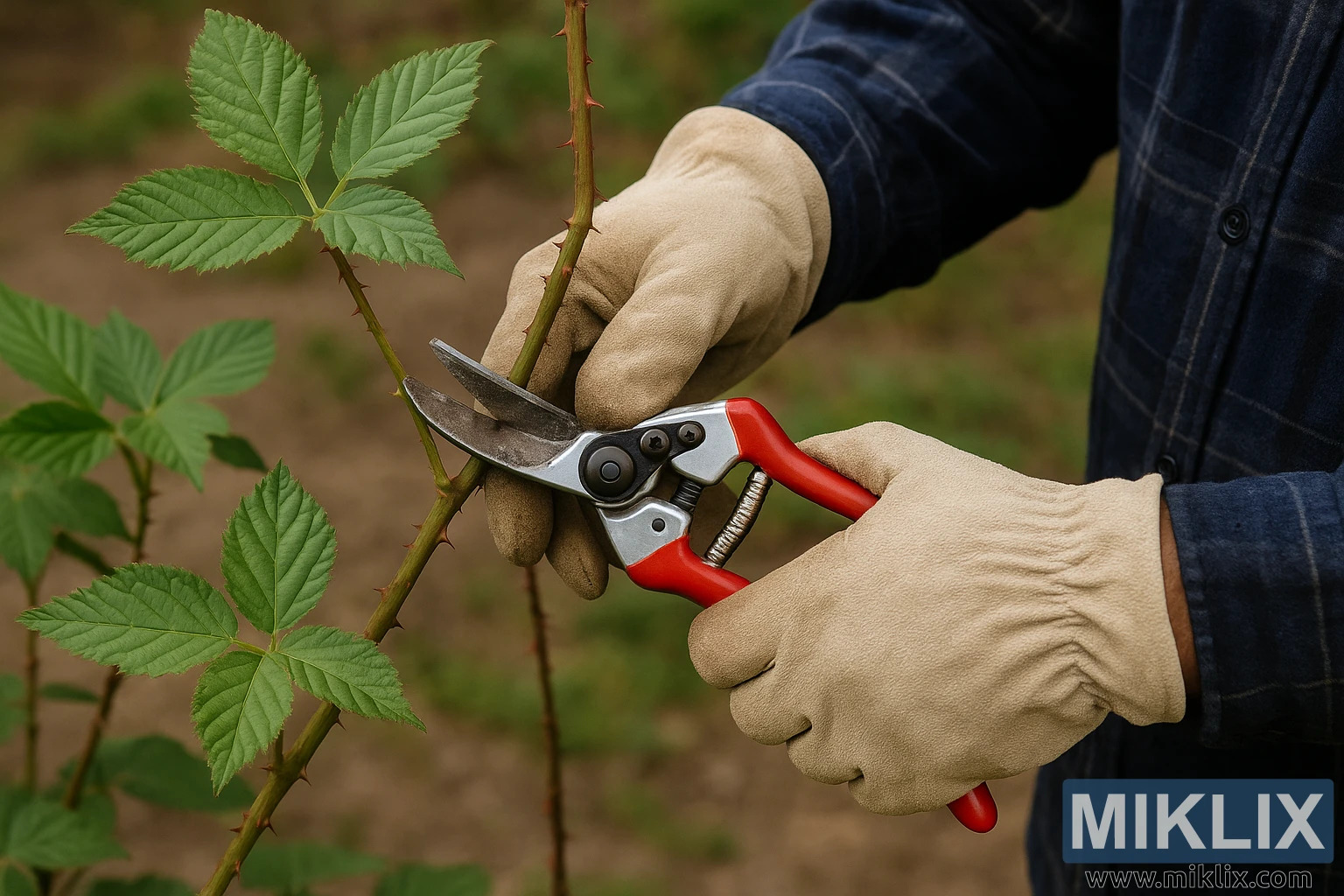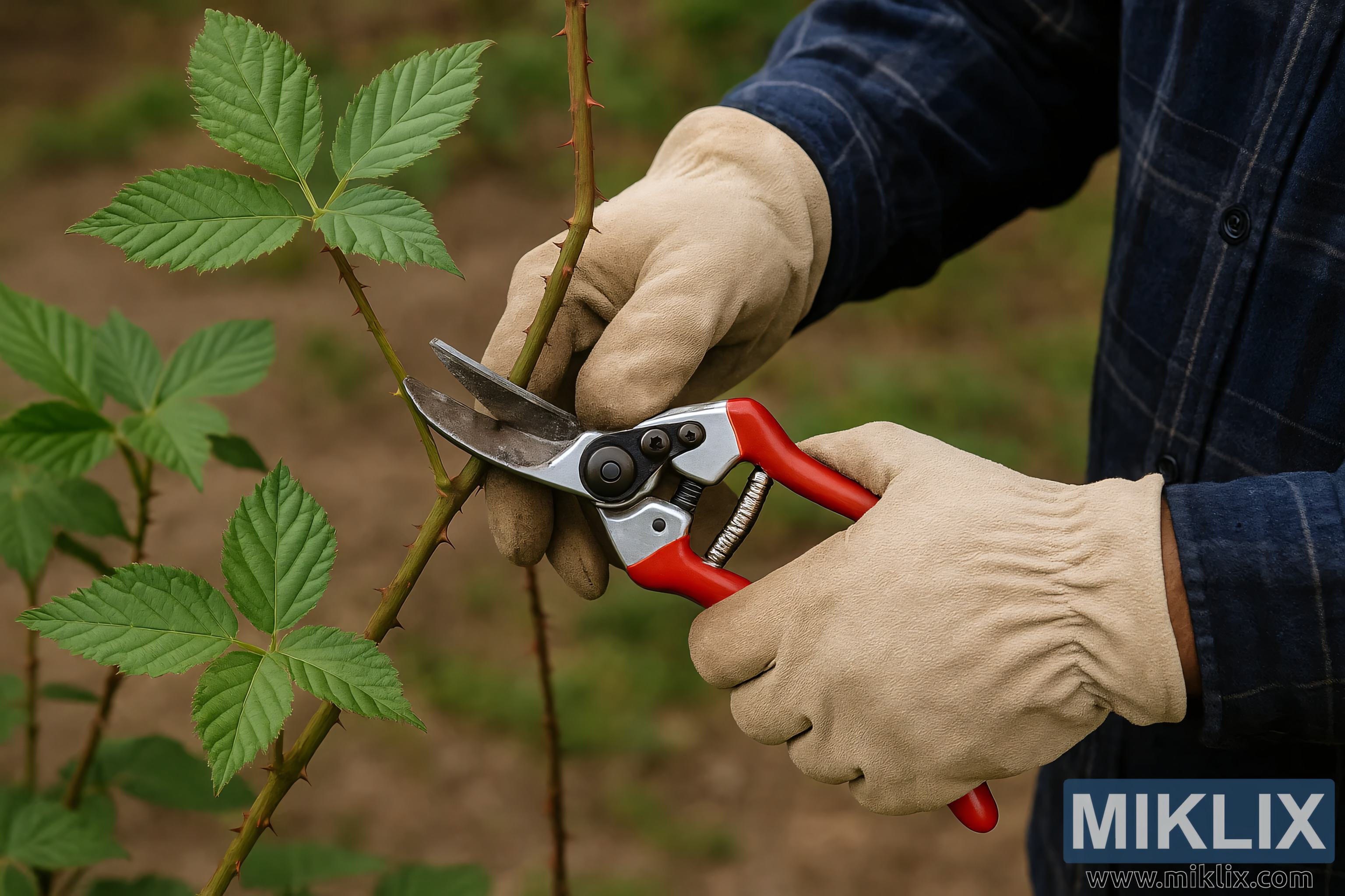 ఈ చిత్రం పగటిపూట బహిరంగ తోటలో బ్లాక్బెర్రీ చెరకును కత్తిరించే తోటమాలి యొక్క వివరణాత్మక, క్లోజప్ వీక్షణను సంగ్రహిస్తుంది. ఈ కూర్పు తోటమాలి చేతి తొడుగులు ధరించిన చేతులపై దృష్టి పెడుతుంది, అవి ముల్లుతో కప్పబడిన చెరకుపై క్లీన్ కట్ చేయడానికి సిద్ధంగా ఉన్న ఎరుపు-హ్యాండిల్ కత్తిరింపు కత్తెరలను నైపుణ్యంగా నిర్వహిస్తాయి. చేతి తొడుగులు లేత గోధుమ రంగులో ఉంటాయి మరియు బాగా అమర్చబడి కనిపిస్తాయి, బ్లాక్బెర్రీ మొక్కలను వర్ణించే పదునైన ముళ్ళ నుండి రక్షణను అందిస్తాయి. ముదురు నీలం రంగు ప్లాయిడ్ చొక్కా ధరించిన తోటమాలి మొండెం, ఫ్రేమ్ యొక్క కుడి వైపున ఆక్రమించి, నేపథ్యం యొక్క మట్టి టోన్లకు వ్యతిరేకంగా కాంట్రాస్ట్ మరియు దృశ్య సమతుల్యతను జోడిస్తుంది.