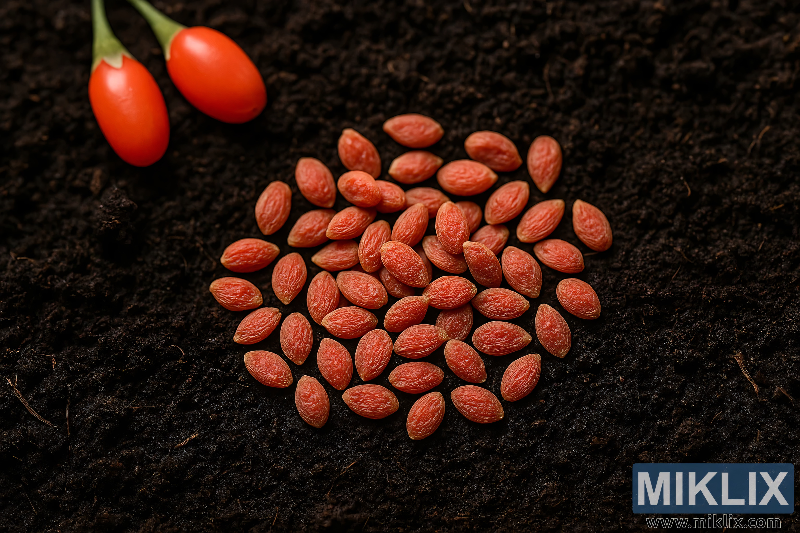 ముదురు రంగు, పోషకాలు అధికంగా ఉన్న నేలపై గోజీ బెర్రీ విత్తనాలను చూపిస్తున్న హై-రిజల్యూషన్ చిత్రం, మూలలో రెండు పండిన బెర్రీలు ఉన్నాయి - సహజ తోటపని మరియు విత్తనాల తయారీ భావనలను వివరించడానికి అనువైనది.