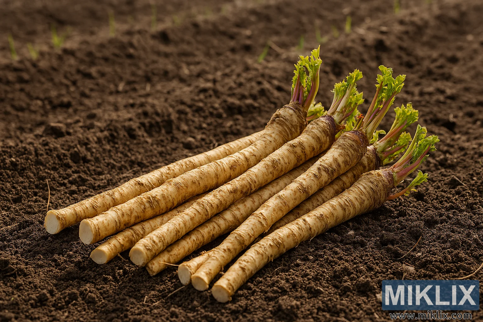 వసంతకాలం ప్రారంభంలో పొలంలో ముదురు గోధుమ రంగు నేలపై తాజాగా పండించిన గుర్రపుముల్లంగి వేర్ల సమూహాన్ని హై-రిజల్యూషన్ ల్యాండ్స్కేప్ ఛాయాచిత్రం సంగ్రహిస్తుంది. వేర్లు ఫ్రేమ్ అంతటా వికర్ణంగా అమర్చబడి ఉంటాయి, వాటి మందమైన చివరలు శక్తివంతమైన ఆకుపచ్చ మొలకలను కలిగి ఉంటాయి, ఎగువ కుడి మూల వైపుకు చూపబడతాయి మరియు తాజాగా కత్తిరించిన, లేత తెల్లటి చివరలు దిగువ ఎడమ వైపుకు ఎదురుగా ఉంటాయి. ప్రతి వేర్లు క్రీమీ లేత గోధుమరంగు రంగులో ఉంటాయి, గరుకుగా, గట్లున్న మరియు కొద్దిగా ముడతలు పడిన చర్మంతో, పీచు తెల్లటి లోపలి భాగాన్ని బహిర్గతం చేయడానికి ప్రదేశాలలో తొక్కబడతాయి. వేర్లు పొడవు మరియు మందంలో మారుతూ ఉంటాయి, కొన్ని దృఢంగా కనిపిస్తాయి మరియు మరికొన్ని సన్నగా కనిపిస్తాయి, వాటి సహజ అసమానతను నొక్కి చెబుతాయి.