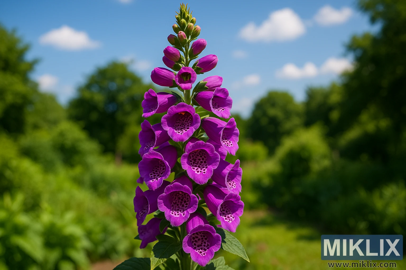 ఫాక్స్గ్లోవ్ యొక్క బలమైన, నిటారుగా ఉండే కాండం దాని బేస్ వద్ద పచ్చని ఆకులతో కప్పబడి ఉంటుంది, విశాలమైన, లాన్సోలేట్ ఆకులు పైన ఉన్న రత్నాల రంగు పువ్వులతో తీవ్రంగా విభేదిస్తాయి. నేపథ్యం మెల్లగా అస్పష్టంగా ఉంది - ఆకుపచ్చ ఆకులు, సూర్యకాంతితో ప్రకాశించే గడ్డి మైదానం మరియు మసక నీడ - పువ్వులు కేంద్రంగా మారడానికి అనుమతించే సహజమైన, ప్రశాంతమైన నేపథ్యాన్ని అందిస్తుంది. మెత్తటి తెల్లటి మేఘాలతో చెల్లాచెదురుగా ఉన్న ఉత్సాహభరితమైన నీలి ఆకాశం, మొత్తం కూర్పును పెంచుతుంది, దృశ్యాన్ని ఒక అత్యద్భుతమైన వేసవి వాతావరణంలో రూపొందిస్తుంది.