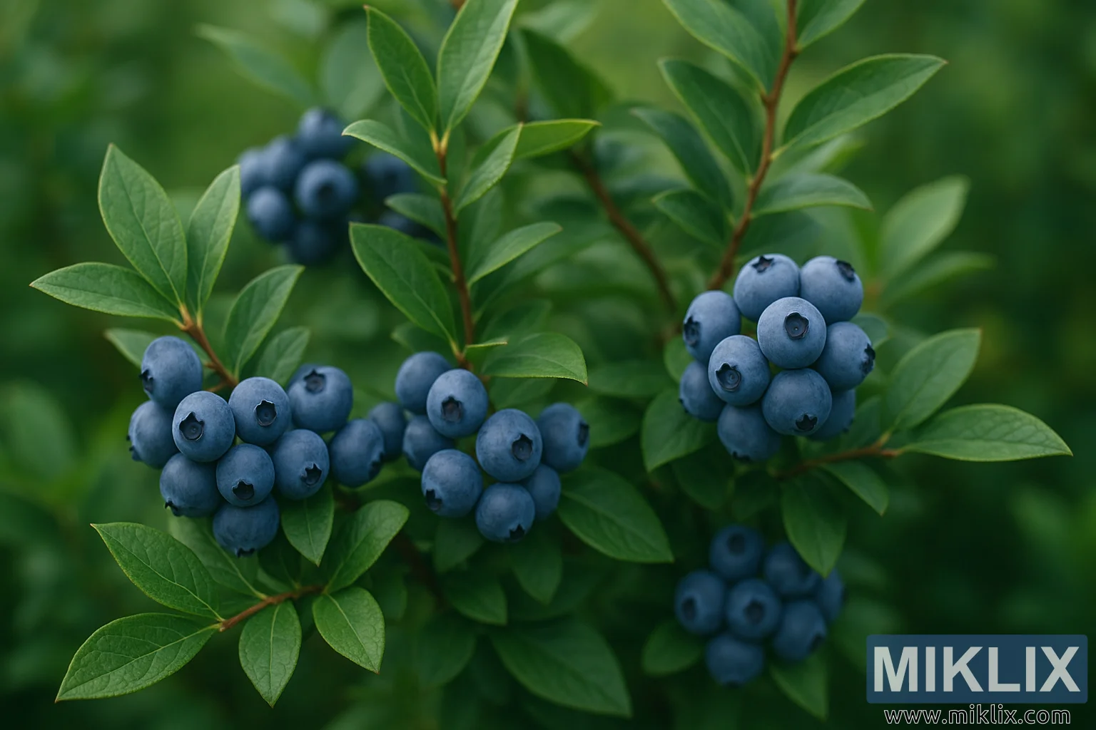 ภาพถ่ายทิวทัศน์ความละเอียดสูงนี้บันทึกภาพพุ่มบลูเบอร์รี่พันธุ์ Northern Highbush (Vaccinium corymbosum) ที่กำลังออกผลอย่างงดงาม องค์ประกอบภาพเน้นไปที่บลูเบอร์รี่สุกหลายช่อ สีน้ำเงินครามเข้มตัดกับดอกแป้งธรรมชาติ ทำให้แต่ละผลดูนุ่มนวลและเรียบลื่น ขนาดของผลบลูเบอร์รี่มีความแตกต่างกันเล็กน้อย สะท้อนถึงการเจริญเติบโตตามธรรมชาติ และเรียงตัวกันเป็นกลุ่มแน่น ห้อยลงอย่างงดงามจากก้านเรียวสีน้ำตาลแดง ใบของพุ่มมีสีเขียวสดใส เป็นมันเงา เรียวยาว เป็นรูปไข่ ขอบเรียบ และมีเส้นกลางใบเด่นชัด ก่อเกิดเป็นฉากหลังอันเขียวชอุ่มที่ตัดกันอย่างสวยงามกับผลบลูเบอร์รี่สีฟ้า แต่ละใบรับแสงแดดที่กระจายตัวแตกต่างกัน ทำให้เกิดเฉดสีที่สลับกันอย่างละเอียดอ่อนจากสีเขียวมรกตเป็นสีเขียวมะกอก และช่วยเสริมจังหวะอันเป็นธรรมชาติขององค์ประกอบภาพ