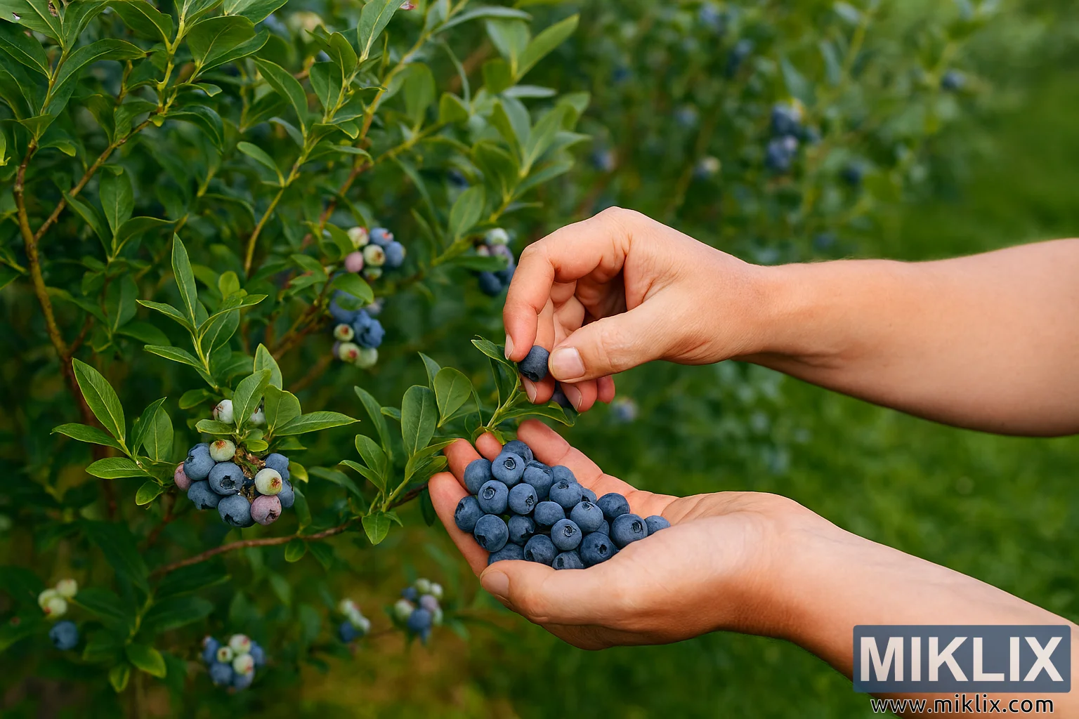 ภาพระยะใกล้ของมือขณะเก็บบลูเบอร์รี่สุกจากพุ่มไม้ที่ให้ผลผลิตในสวนเขียวชอุ่ม แสดงให้เห็นความงดงามของการเก็บผลไม้ในฤดูร้อน