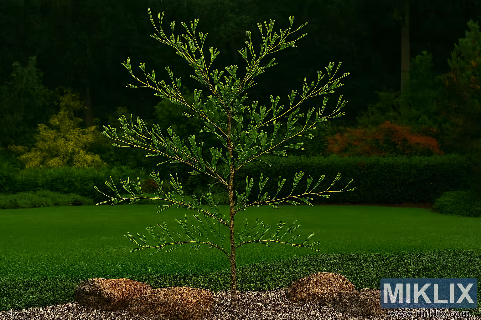 ค้นพบต้นแปะก๊วยซาราโตกา ที่มีใบแคบรูปหางปลาที่สง่างามและรูปทรงประติมากรรมท่ามกลางภูมิทัศน์สวนอันเงียบสงบ