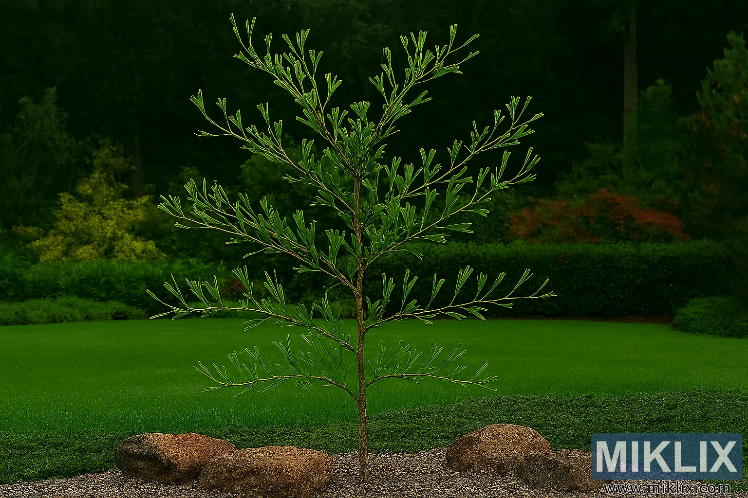 ภาพทิวทัศน์ความละเอียดสูงนี้บันทึกภาพต้นแปะก๊วยซาราโตกา (Ginkgo biloba 'Saratoga') ที่โตเต็มที่ เป็นจุดศูนย์กลางของสวนที่ออกแบบอย่างพิถีพิถัน ต้นแปะก๊วยตั้งตรงอย่างสง่างาม กิ่งก้านแผ่กว้างเล็กน้อย ประดับประดาด้วยใบรูปพัดเรียวยาวเรียวแหลมเป็นเอกลักษณ์ ปลายใบเรียวแหลมคล้ายหางปลา ใบมีสีเขียวสดใส ผิวสัมผัสเรียบลื่น และมีเส้นใบบางๆ แผ่ขยายออกจากโคนใบ รูปทรงเพรียวบางและประณีตกว่าใบแปะก๊วยทั่วไป ทำให้ต้นไม้มีรูปลักษณ์งดงามและประณีตงดงาม