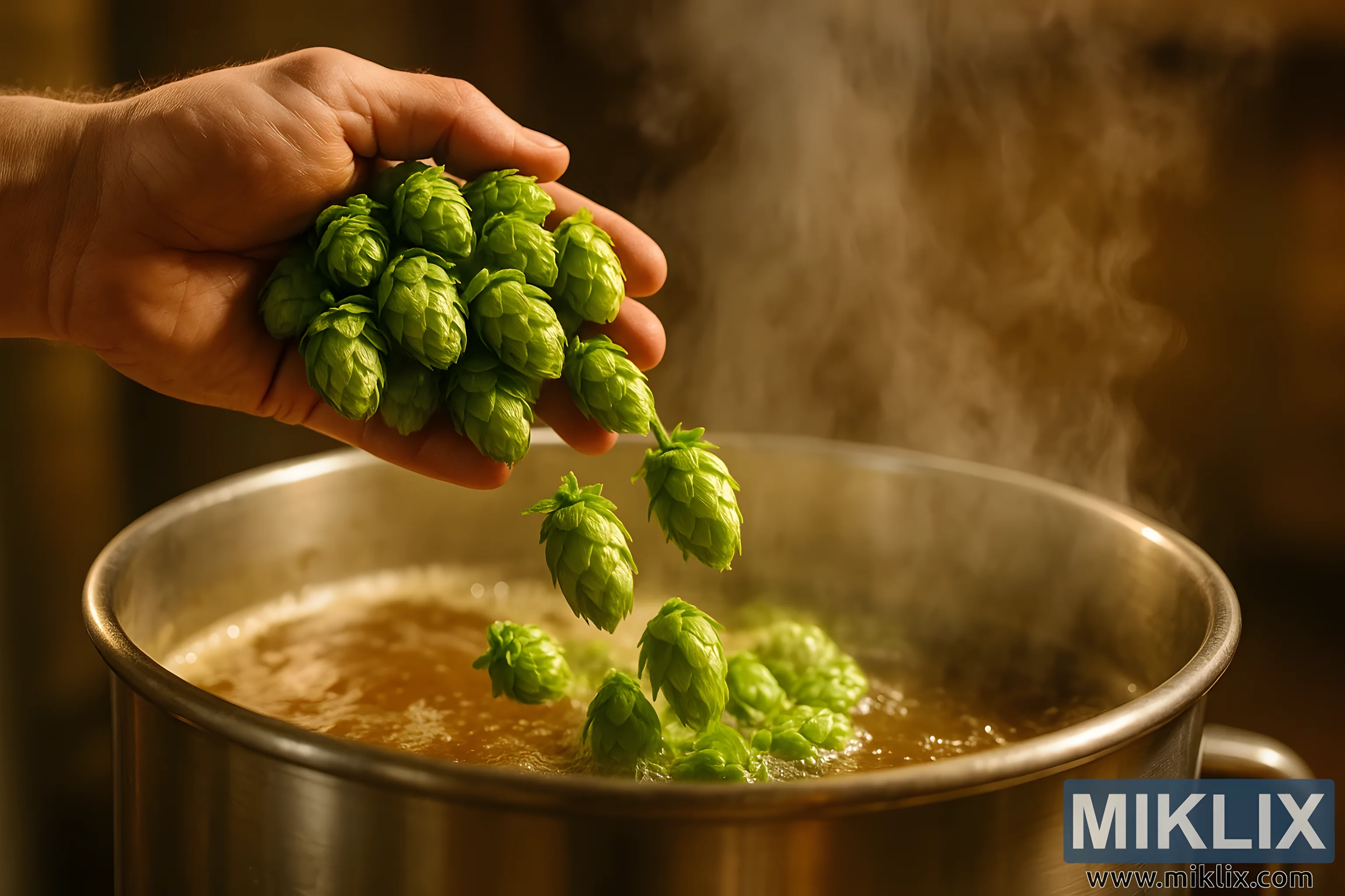 ภาพนี้บันทึกช่วงเวลาสำคัญ ณ ใจกลางกระบวนการผลิตเบียร์ ที่ซึ่งประเพณีและฝีมือสัมผัสผสานรวมกันเป็นหนึ่งเดียวอย่างเด็ดขาด มือข้างหนึ่งลอยอยู่เหนือหม้อต้มเบียร์สแตนเลส ถือกรวยฮ็อป Huell Melon ที่สดใหม่และมีชีวิตชีวา เกล็ดสีเขียวมรกตเรียงตัวกันแน่นและเปล่งประกายด้วยเรซินลูปูลิน ฮ็อปเหล่านี้ดูมีชีวิตชีวาในความสดใส แต่ละกรวยเปรียบเสมือนภาชนะที่เปี่ยมไปด้วยพลังแห่งกลิ่นหอม พร้อมที่จะปลดปล่อยน้ำมันและกรดที่จะหล่อหลอมเอกลักษณ์ของเบียร์ที่จะมาถึง ขณะที่กรวยฮ็อปบางอันร่วงหล่นจากมือของผู้ผลิตลงสู่ของเหลวเดือดพล่านเบื้องล่าง ไอระเหยก็พวยพุ่งขึ้นเป็นสายน้ำวน พัดพากลิ่นหอมของน้ำตาลมอลต์หวานที่ผสมผสานกัน และกลิ่นแรกเริ่มของความคมของฮ็อปมาด้วย