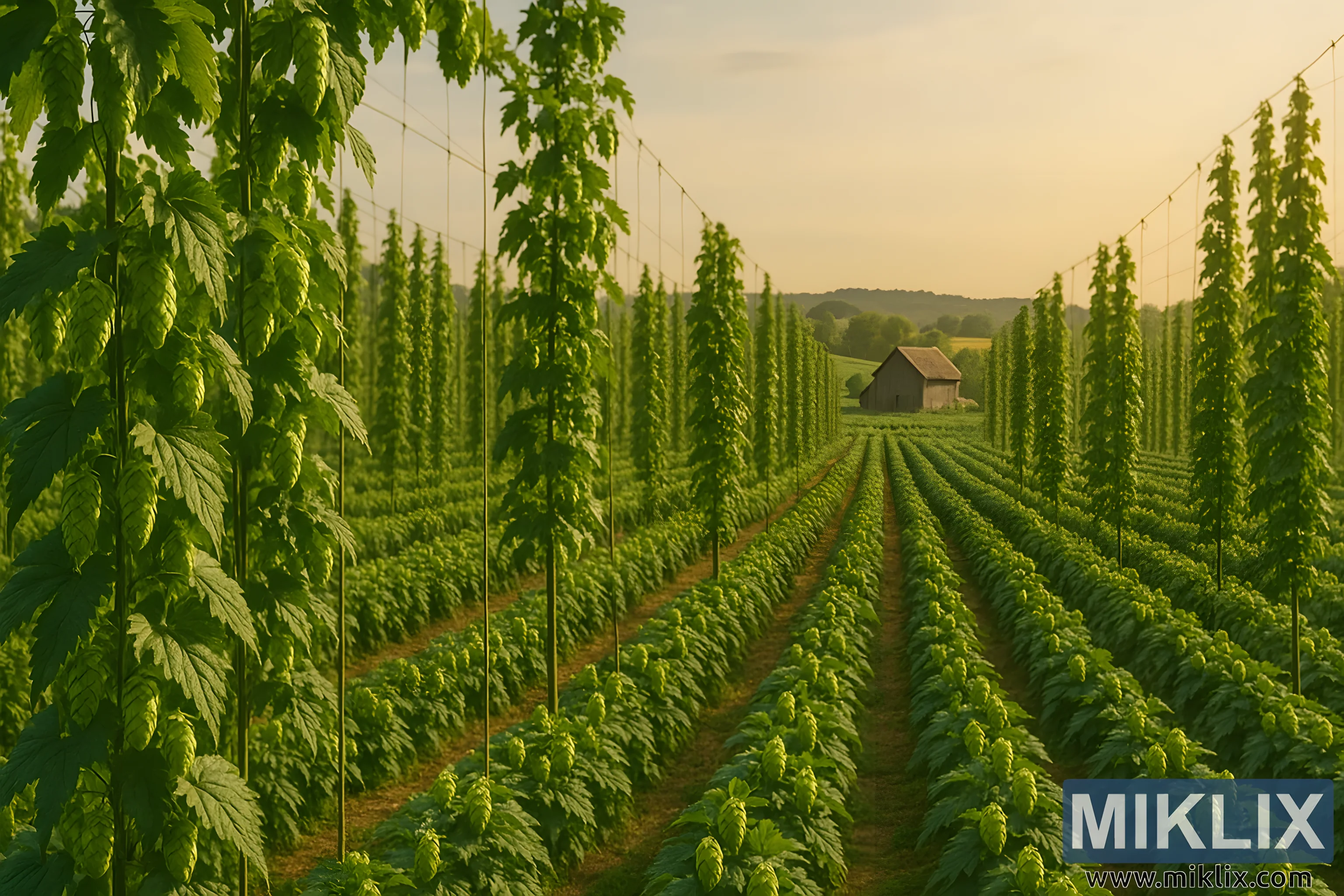 ทุ่งฮอปส์ที่ได้รับแสงแดดส่องถึงพร้อมด้วยไม้เลื้อยสีเขียวชอุ่มที่เลื้อยไปตามโครงไม้ แถวของต้นไม้ และโรงนาแบบชนบทในระยะไกล ซึ่งเป็นสัญลักษณ์ของความอุดมสมบูรณ์และความพร้อมในการเก็บเกี่ยว