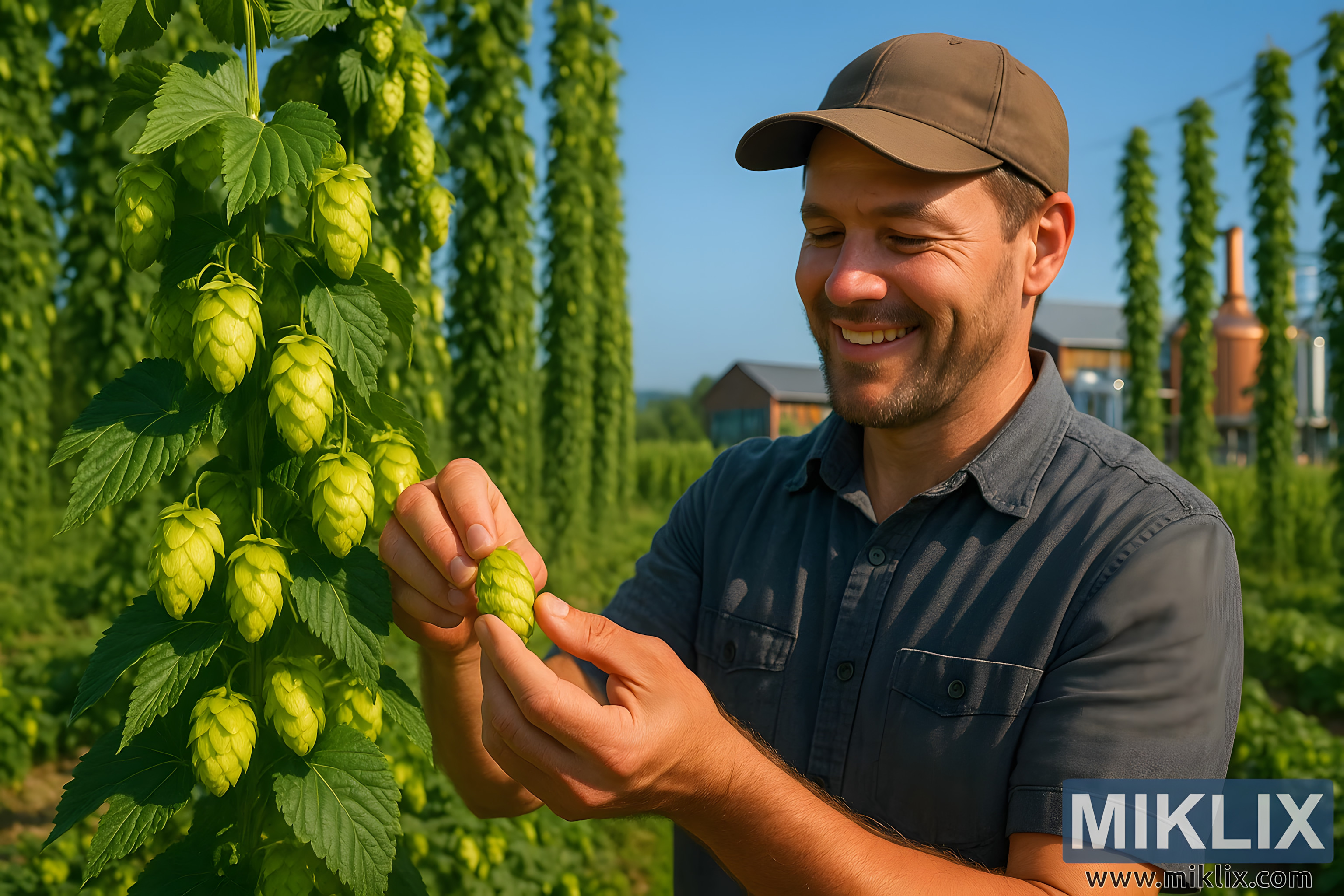 ชาวนาเก็บผลเมลอน Huell ในทุ่งเขียวขจีภายใต้ท้องฟ้าสีคราม โดยมีโรงเบียร์อยู่เบื้องหลัง สื่อถึงความอุดมสมบูรณ์และประเพณีการผลิตเบียร์ฝีมือ