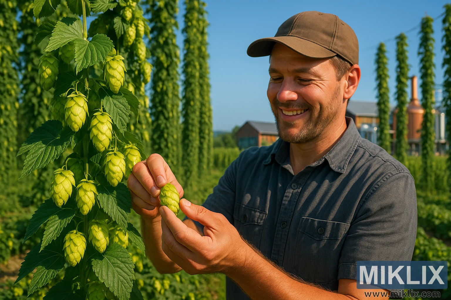 รอบๆ เขา ลานฮอปส์มีชีวิตชีวาและมีชีวิตชีวา กิ่งก้านสูงตระหง่านทอดยาวขึ้นสู่ท้องฟ้า เรียงตัวตามแนวเส้นที่เลือนหายไปในสีฟ้าใสเบื้องบน ก่อเกิดเป็นกำแพงสีเขียวที่พลิ้วไหวไปตามสายลม ต้นไม้แต่ละต้นเปรียบเสมือนผืนผ้าทอแนวตั้งที่ประกอบด้วยใบและโคน เป็นเครื่องยืนยันถึงความอุดมสมบูรณ์ของผืนดินและการดูแลเอาใจใส่ของผู้ปลูก แถวที่เรียงกันทอดยาวออกไปไกลสุดลูกหูลูกตา ความสมมาตรถูกทำลายลงเพียงการขยับเล็กน้อยของต้นฮอปส์ขณะที่ลมพัดผ่าน กระซิบแผ่วเบาราวกับเสียงประสานของคณะนักร้องประสานเสียงที่ไม่มีใครเห็น ช่วงเวลาแห่งฤดูกาลคือช่วงที่โคนผลสุกงอมพร้อมเก็บเกี่ยว อบอวลไปด้วยน้ำมันหอมระเหยที่จะหล่อหลอมรสชาติของเบียร์ที่คุ้นเคยจากแดนไกลโพ้น