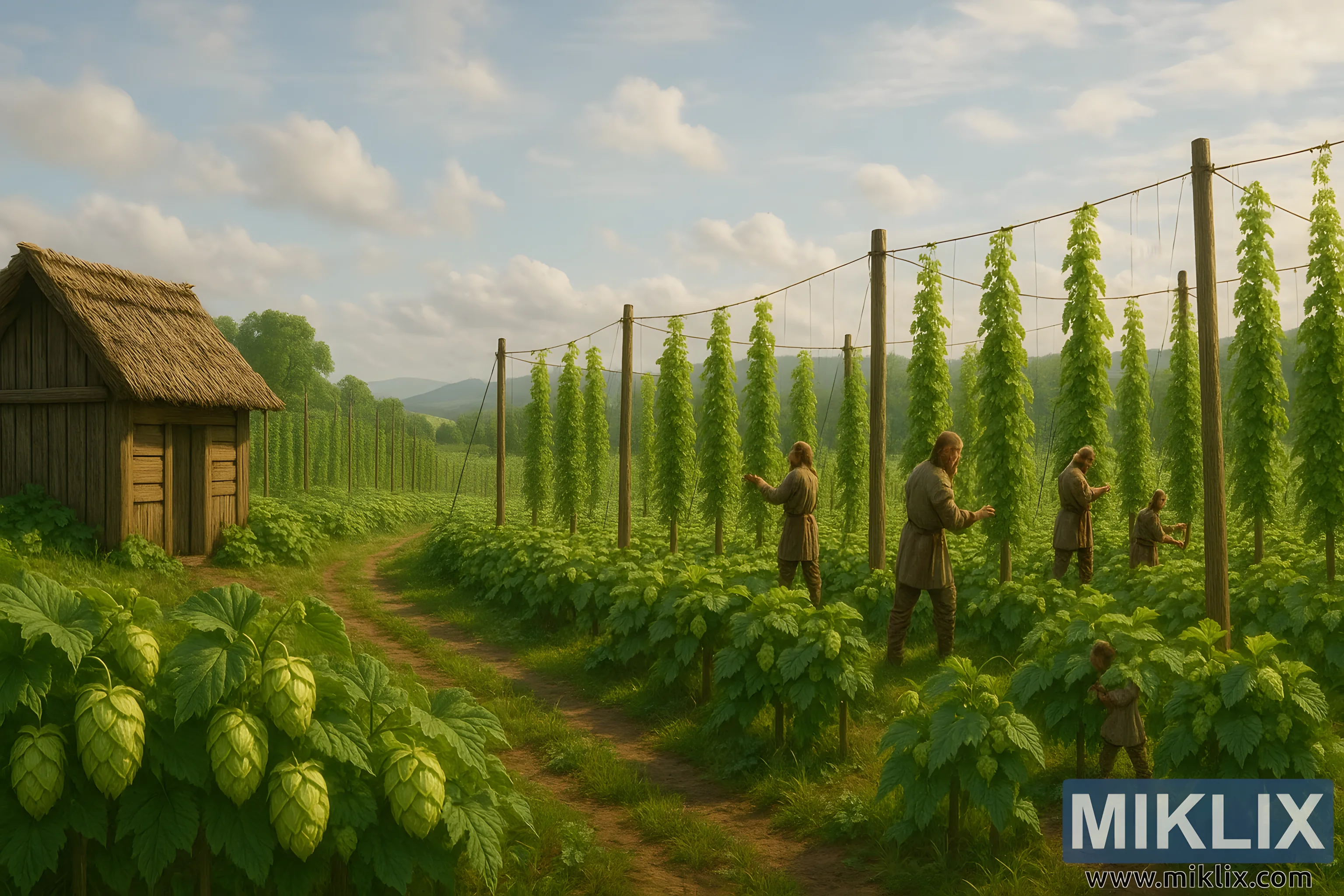 ทุ่งฮ็อปไวกิ้งอันเขียวชอุ่มพร้อมด้วยเกษตรกรที่กำลังดูแลเถาวัลย์อยู่ข้างโรงเก็บของสไตล์ชนบทภายใต้แสงแดดอันอบอุ่น ตัดกับเนินเขาและท้องฟ้าสีฟ้าในฉากเหนือกาลเวลา