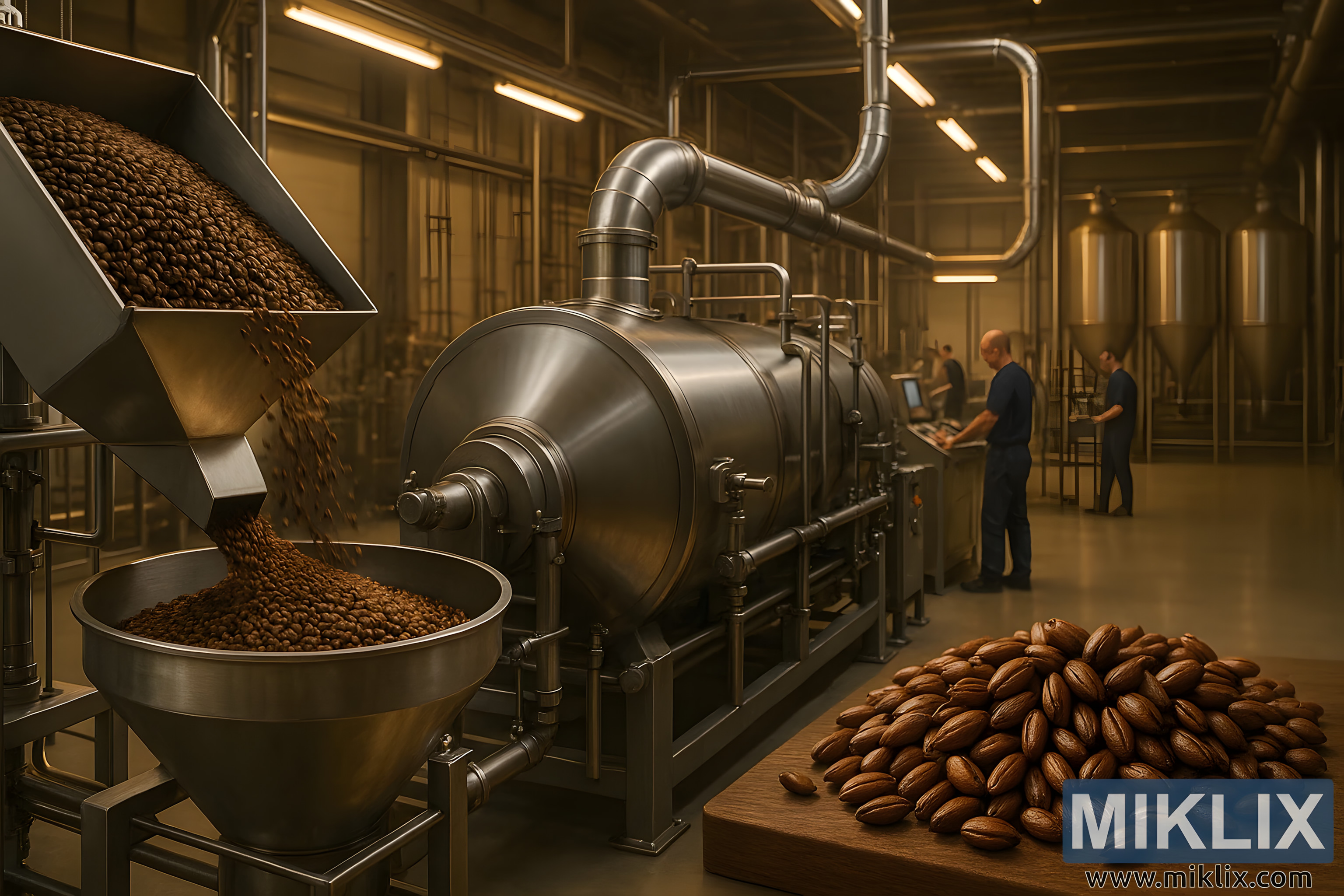 เบื้องหน้า ถังมอลต์ขนาดใหญ่ตั้งตระหง่านเป็นเสมือนประตูสู่กระบวนการแปรรูป ถังนี้ป้อนเมล็ดมอลต์ช็อกโกแลตสีซีดเต็มเมล็ดอย่างต่อเนื่องเข้าไปในเตาหมุน ซึ่งเป็นภาชนะทรงกระบอกที่หมุนช้าๆ อย่างสง่างาม เมล็ดมอลต์สีน้ำตาลทองเมื่อเข้าเตา จะถูกนำไปผ่านกระบวนการคั่วอย่างนุ่มนวลขณะที่กลิ้งไปมาภายในเตา ค่อยๆ เปลี่ยนเป็นสีมะฮอกกานีเข้มข้น ขั้นตอนนี้สำคัญมาก หากใช้ความร้อนมากเกินไป มอลต์จะมีรสขมและเปรี้ยว หากใช้ความร้อนน้อยเกินไป รสชาติที่ซับซ้อนตามที่ต้องการจะยังคงอยู่ การหมุนของเตาช่วยให้มั่นใจได้ว่ามอลต์จะกระจายตัวอย่างสม่ำเสมอ และอุณหภูมิของเตาจะถูกควบคุมอย่างระมัดระวังด้วยเครือข่ายวาล์วและเซ็นเซอร์ที่เรียงรายอยู่ภายนอก ส่วนประกอบเหล่านี้ มีความซับซ้อนและแวววาว สะท้อนให้เห็นถึงความมุ่งมั่นของโรงงานในการควบคุมและคงความสม่ำเสมอ