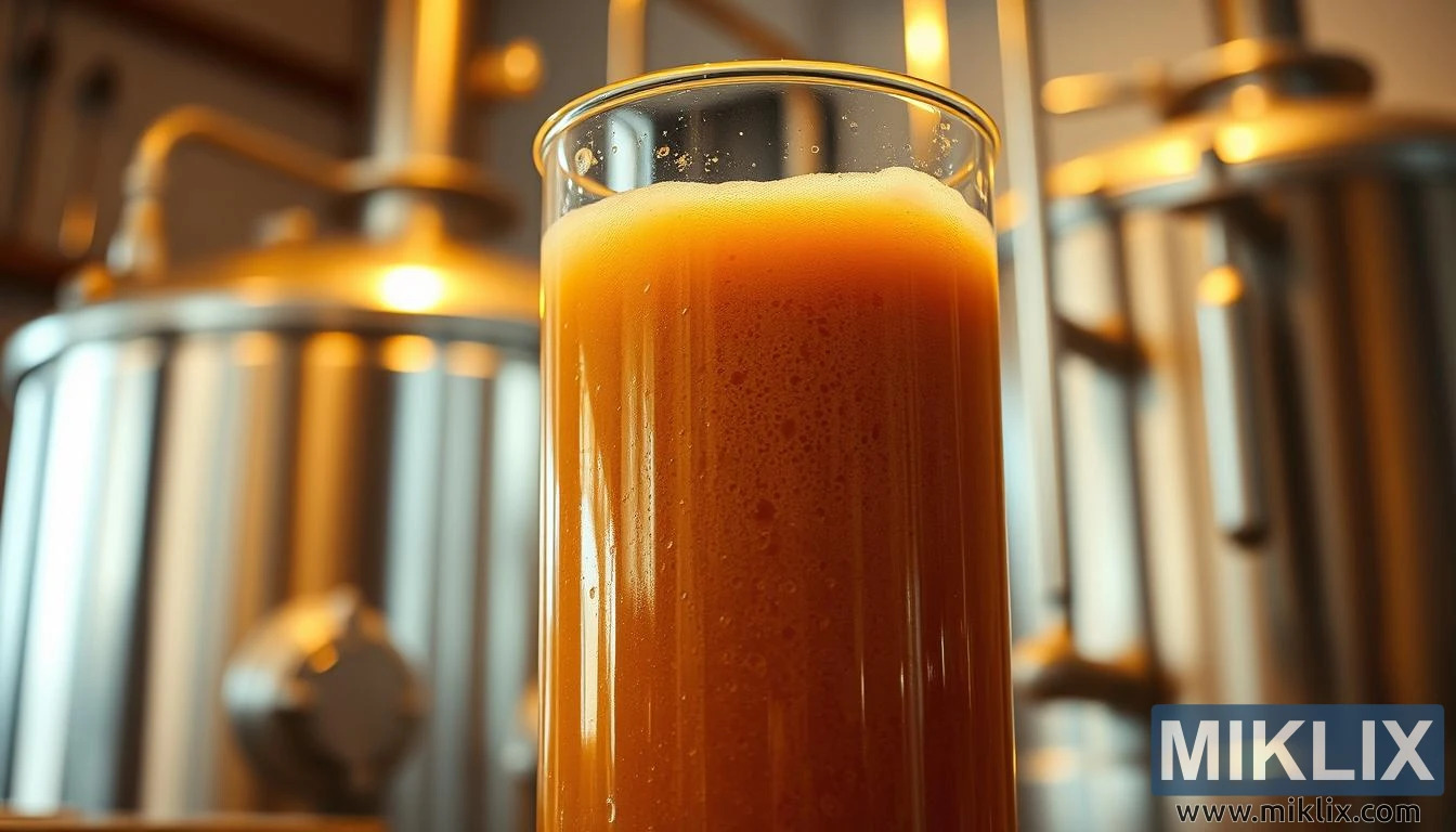 บีกเกอร์แก้วบรรจุของเหลวสีน้ำตาลคล้ายฟองในแสงอุ่น โดยมีอุปกรณ์การต้มเบียร์เบลออยู่เบื้องหลัง จับภาพการหมักมอลต์สีน้ำตาลในการต้มเบียร์