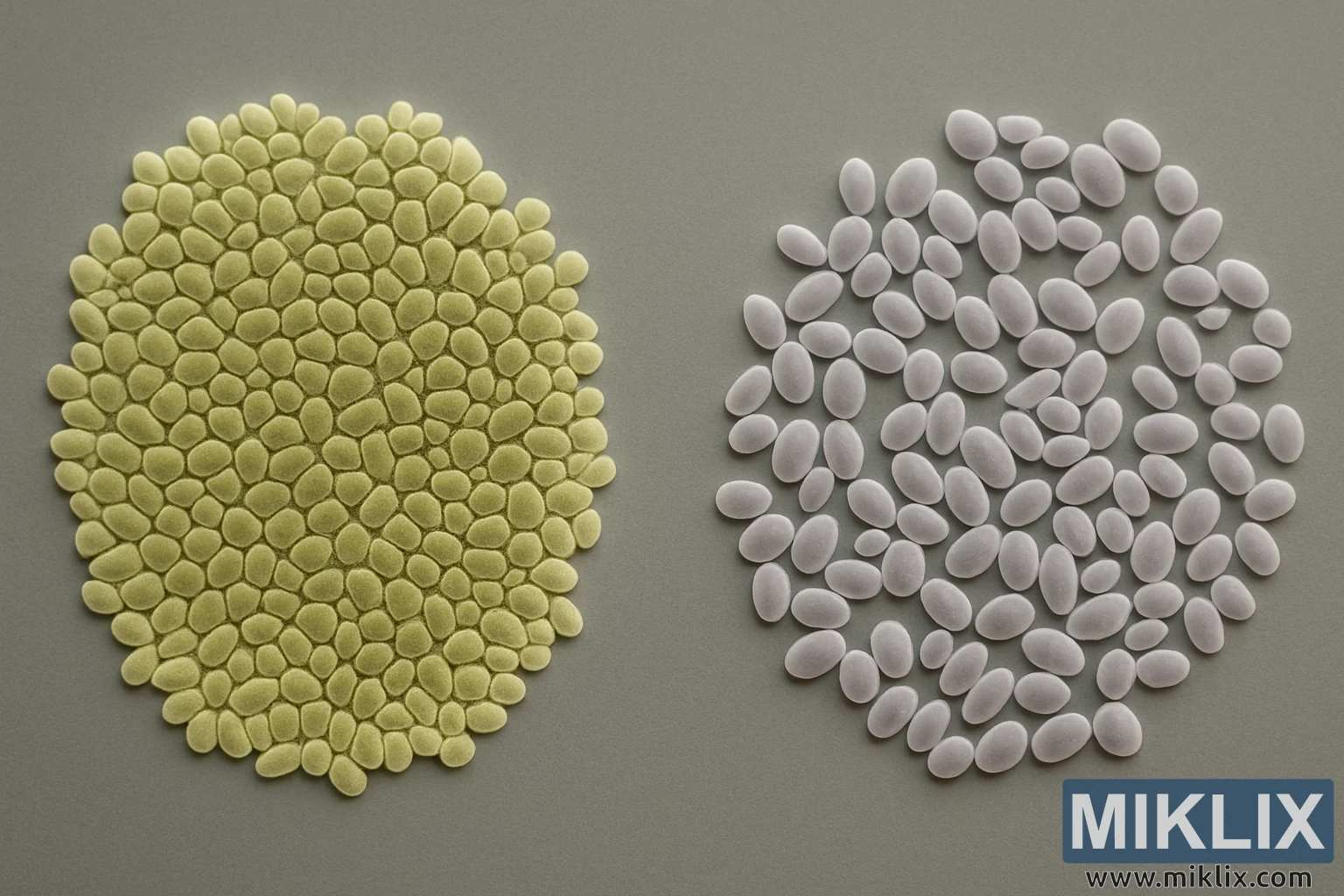 ทางด้านซ้ายของภาพ กลุ่มเซลล์ยีสต์ที่เรียงตัวกันอย่างแน่นหนา ก่อตัวเป็นโครงสร้างที่หนาแน่นและต่อเนื่องกัน เซลล์มีรูปร่างเป็นวงรี แบนเล็กน้อยตามขอบที่กดทับกัน ก่อให้เกิดลวดลายแบบ tessellated คล้ายกับหินกรวดหรือเกล็ด สีของพวกมันโน้มไปทางสีเขียวอมเหลืองอ่อนๆ เกือบเป็นสีเขียวมะกอก บ่งบอกถึงสายพันธุ์ที่มีสัณฐานวิทยาที่เข้มกว่าหรือมีเม็ดสีมากกว่าเล็กน้อย ความแน่นของกลุ่มเซลล์นี้ให้ความรู้สึกถึงการยึดเกาะกันอย่างแน่นหนาระหว่างเซลล์ ซึ่งอาจสะท้อนถึงแนวโน้มการจับตัวเป็นก้อน ซึ่งเซลล์ยีสต์จะเกาะกลุ่มกันในระหว่างการหมัก ความสม่ำเสมอของขนาดและรูปร่างภายในกลุ่มนี้เน้นย้ำถึงความเป็นระเบียบและความมั่นคง แม้ว่าเฉดสีที่แตกต่างกันเล็กน้อยในแต่ละเซลล์จะสร้างความลึกและความสมจริง พื้นผิวมีความนุ่มดุจกำมะหยี่ เกือบจะนุ่มฟู บ่งบอกถึงคุณภาพพื้นผิวตามธรรมชาติที่มองเห็นได้เฉพาะเมื่อขยายภาพ