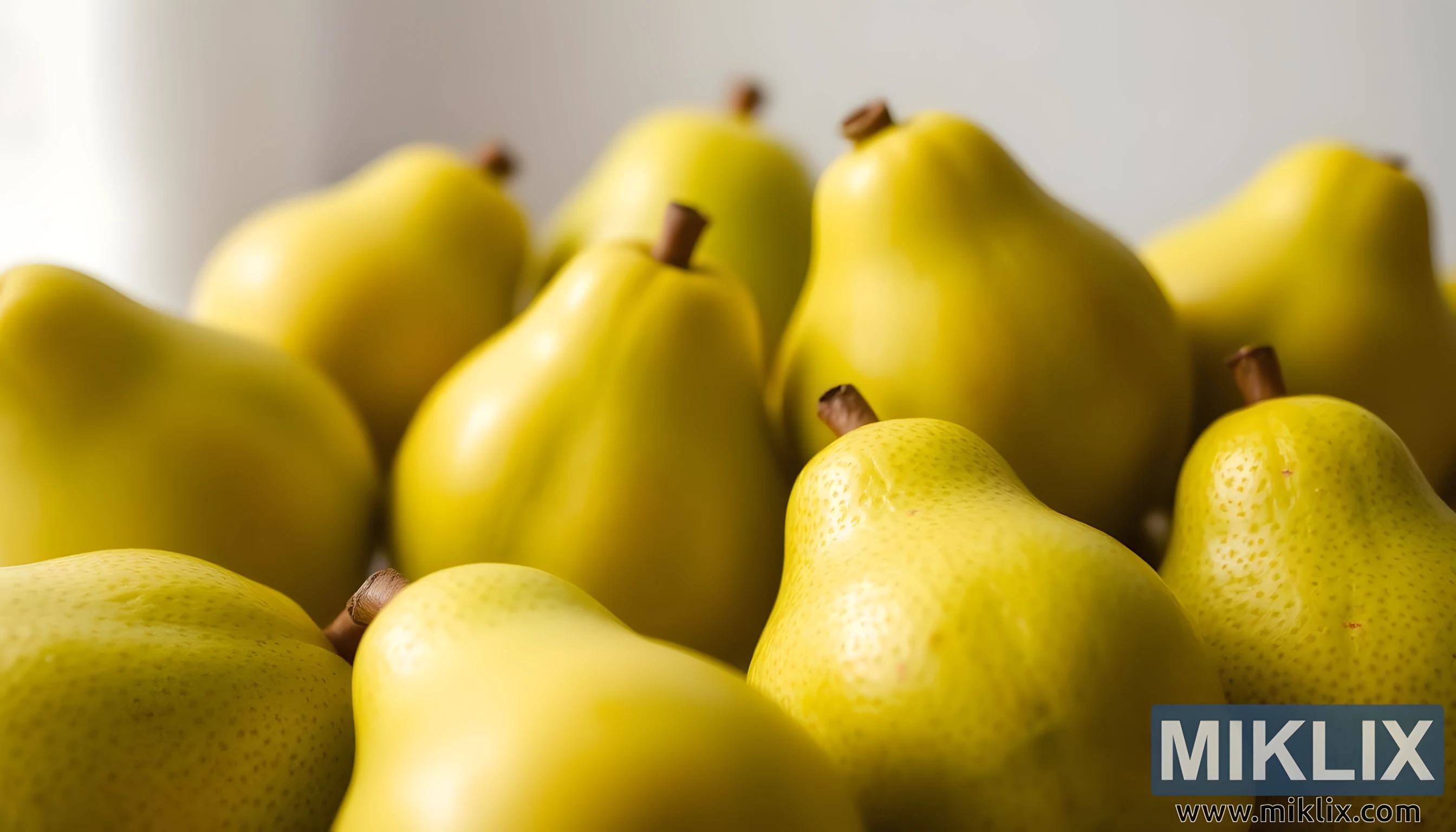 ภาพนี้นำเสนอภาพระยะใกล้ที่สวยงามของลูกแพร์สุกงอมสีเหลืองทองหลายลูก จัดกลุ่มกันอย่างกลมกลืนเพื่อเน้นย้ำถึงความสง่างามตามธรรมชาติและรูปทรงที่เป็นธรรมชาติ ผิวที่เรียบลื่นและมันวาวสะท้อนแสงธรรมชาติอ่อนๆ ที่ส่องกระทบ ก่อให้เกิดแสงธรรมชาติที่นุ่มนวล ดึงดูดความสนใจไปที่ความอวบอิ่มและความสดชื่นชวนลิ้มลองของผลไม้ ลูกแพร์แต่ละลูกมีรูปทรงหยดน้ำที่คุ้นเคย ฐานที่กว้างกว่าเล็กน้อยและเรียวลงอย่างงดงามไปทางก้าน ซึ่งยื่นออกมาจากด้านบนในโทนสีดินและไม้ ตัดกับพื้นผิวสีเหลืองสดใสได้อย่างน่าพึงพอใจ จุดเล็กๆ ที่กระจายอยู่ทั่วเปลือกช่วยเพิ่มเนื้อสัมผัสและความแท้จริง ชวนให้ผู้ชมนึกถึงการเจริญเติบโตและความสุกงอมตามธรรมชาติของผลไม้