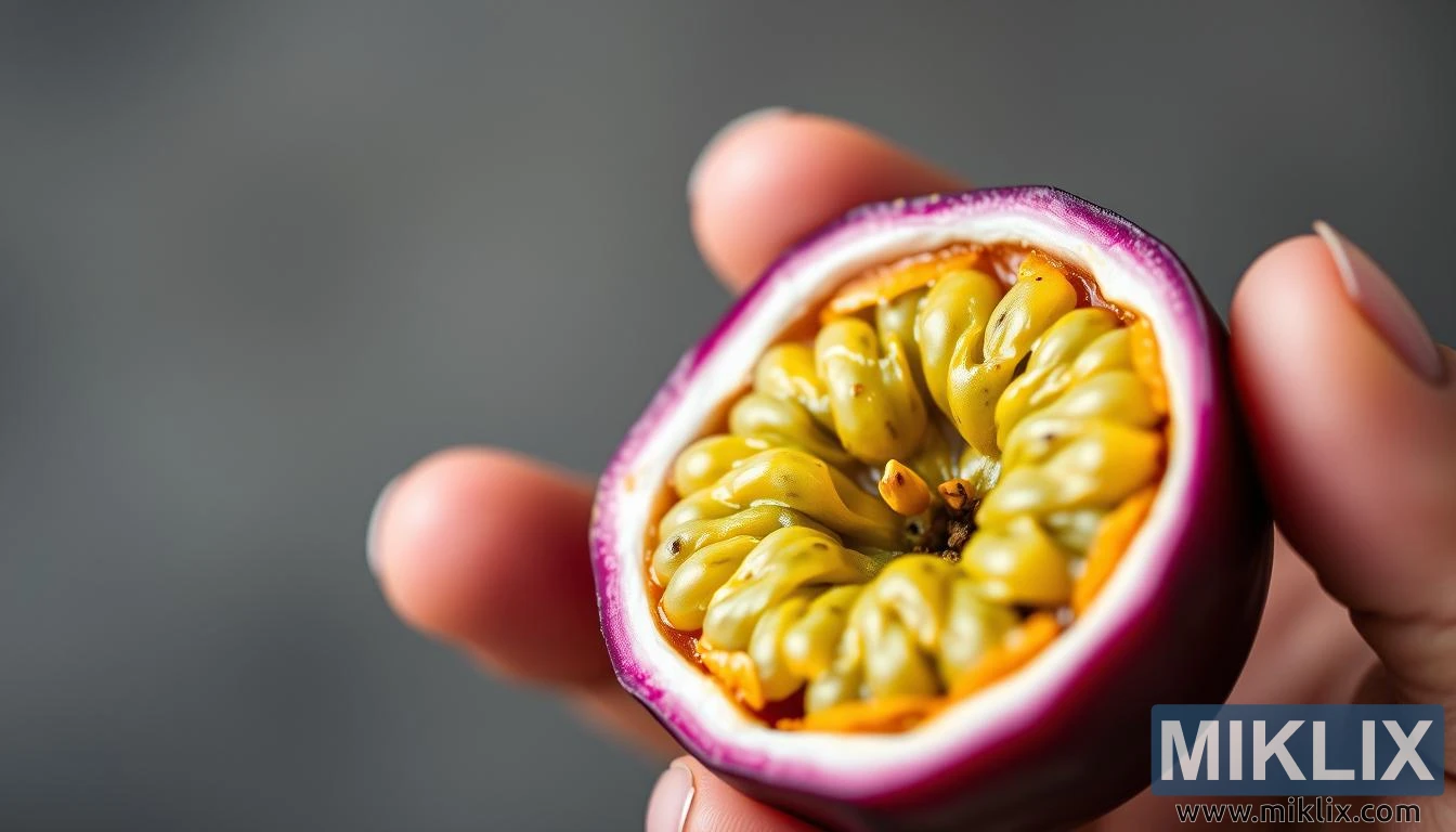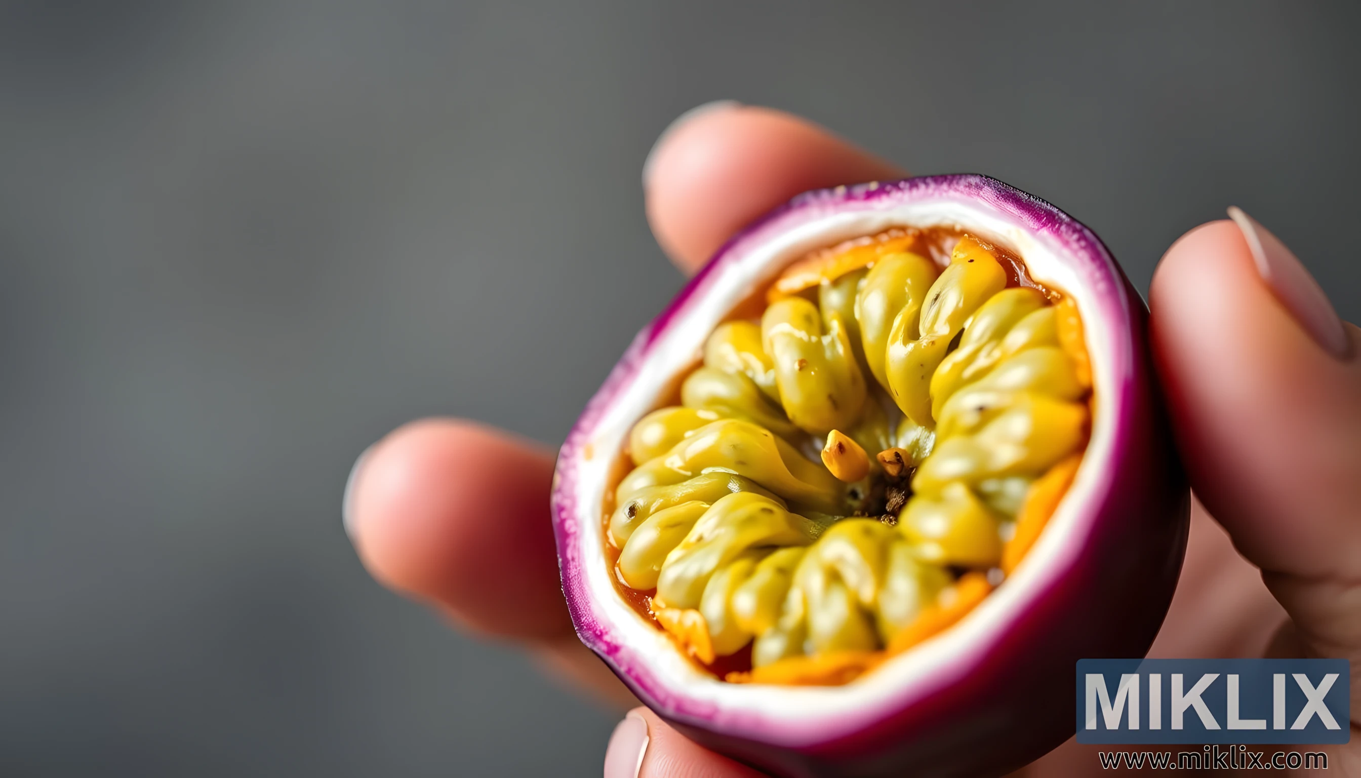 ภาพระยะใกล้ของเสาวรสที่มีเนื้อข้างในเป็นเมล็ดถืออยู่ในมือ ซึ่งสื่อถึงปัญหาการย่อยอาหารและอาการแพ้ที่อาจเกิดขึ้นอันเนื่องมาจากการบริโภคมากเกินไป