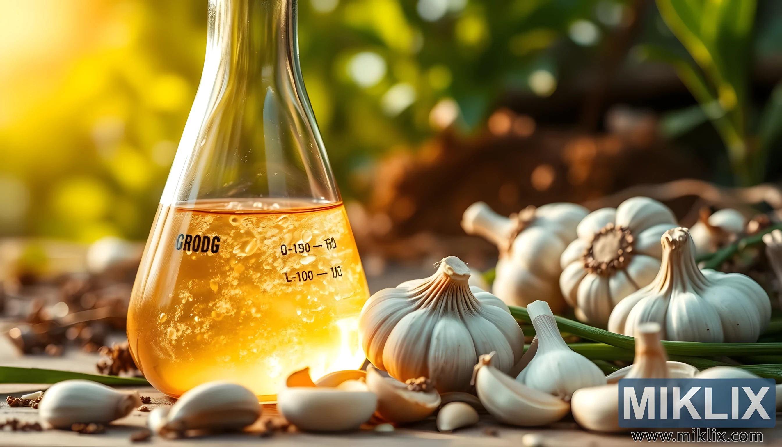 บีกเกอร์แก้วบรรจุของเหลวสีทองและหัวกระเทียมสดในฉากธรรมชาติอันเงียบสงบ สื่อถึงความกลมกลืนของวิทยาศาสตร์และคุณสมบัติการรักษาของธรรมชาติ