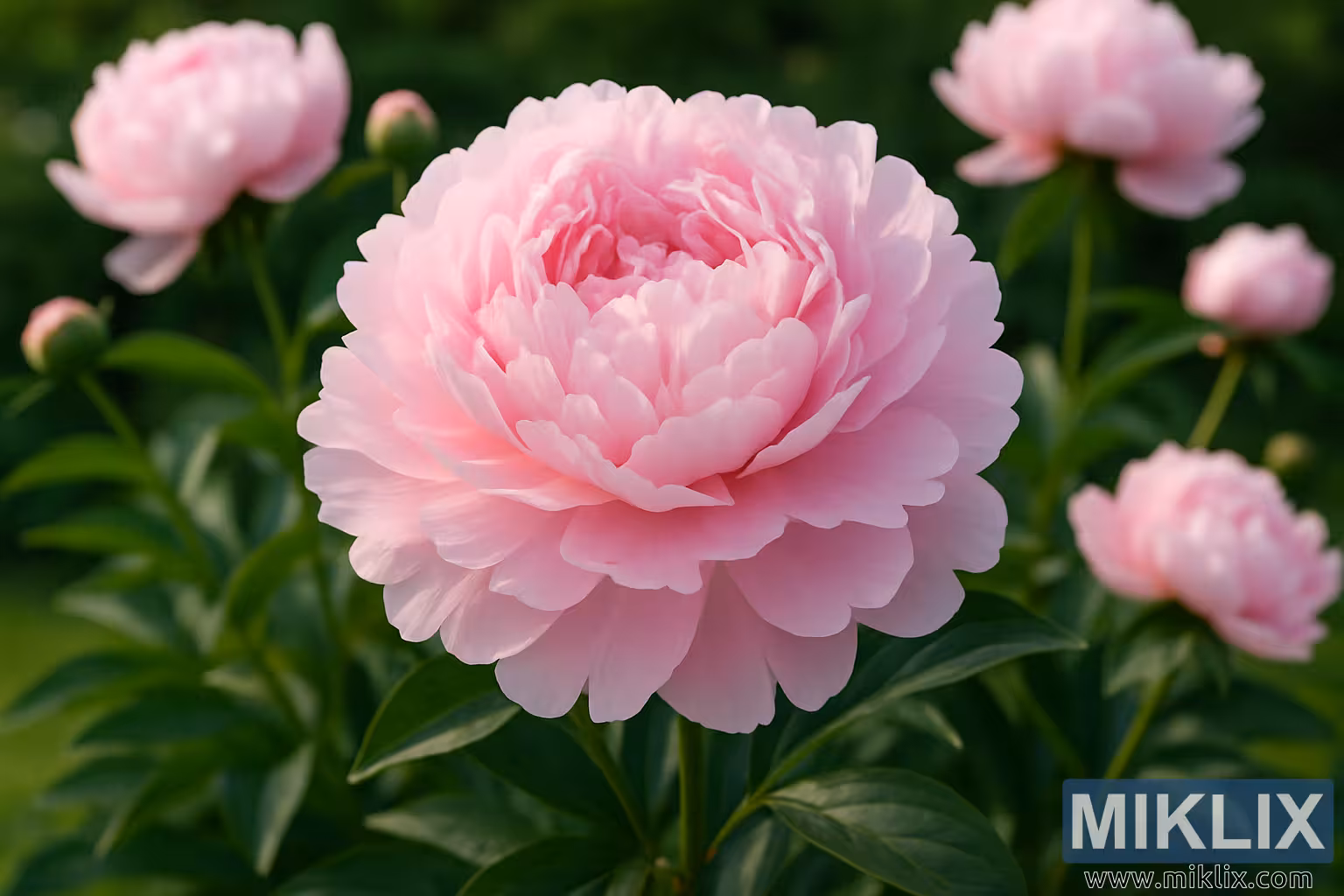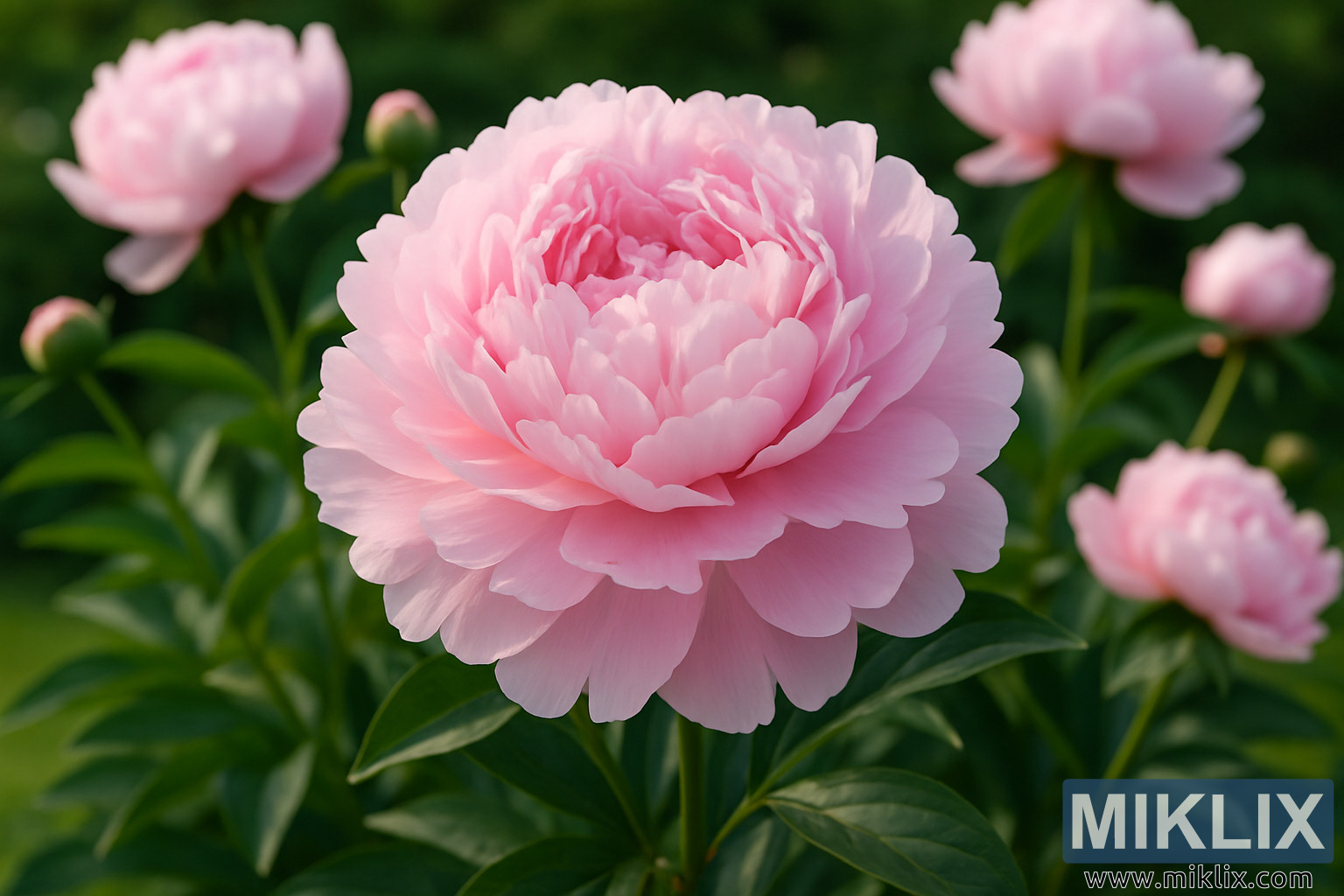 Bu yakın çekim fotoğrafta Sarah Bernhardt şakayığının zamansız güzelliğini keşfedin; büyük, yumuşak pembe çift çiçekleri, narin taç yaprak detayları ve romantik bahçe cazibesini sergiliyor.