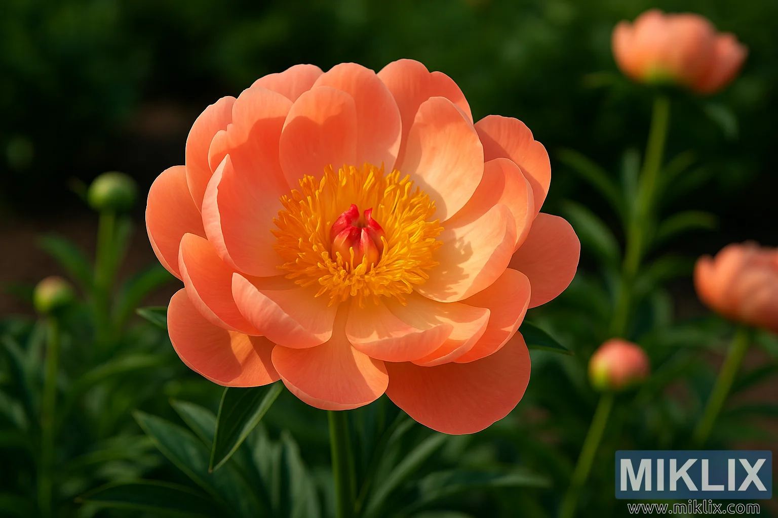 Bu yakın çekim fotoğrafta, mercan pembesi yaprakları şeftali rengine ve canlı altın rengi organlara sahip yarı çift çiçeklerini yemyeşil bir bahçe ortamında sergileyen Coral Charm şakayığının eşsiz güzelliğini keşfedin.