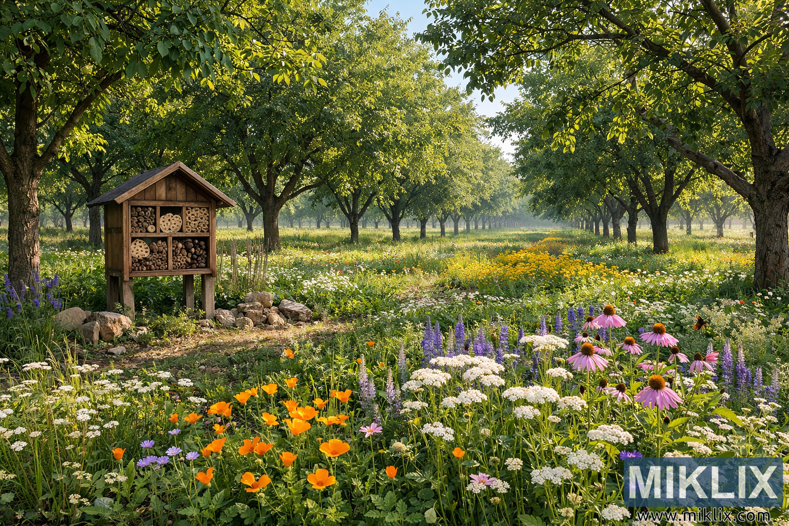 Çeşitli çiçekli yer örtüsü bitkileri ve böcek oteli içeren, sürdürülebilir bir ceviz bahçesinin yüksek çözünürlüklü manzara görüntüsü; biyoçeşitliliği, ekolojik tarımı ve faydalı böcek yaşam alanını vurguluyor.