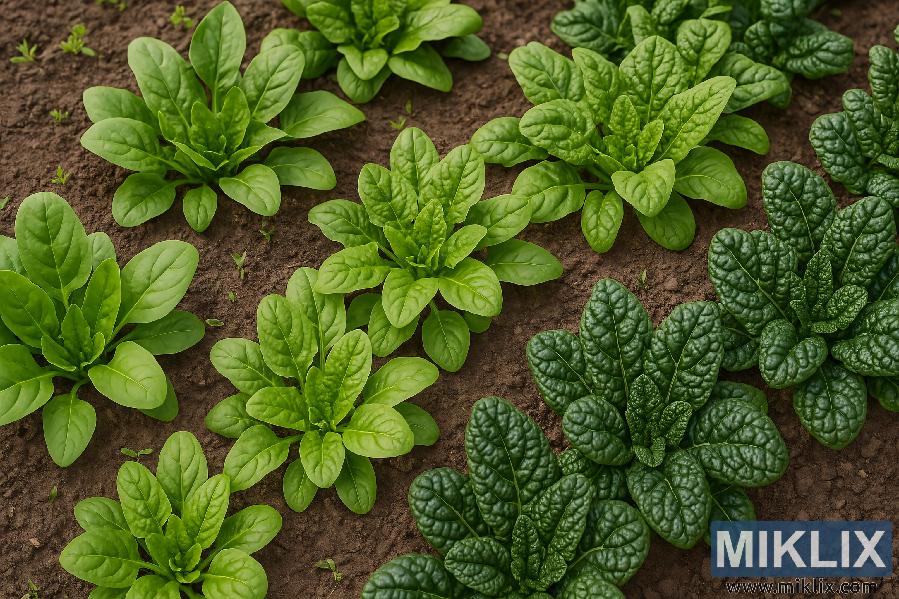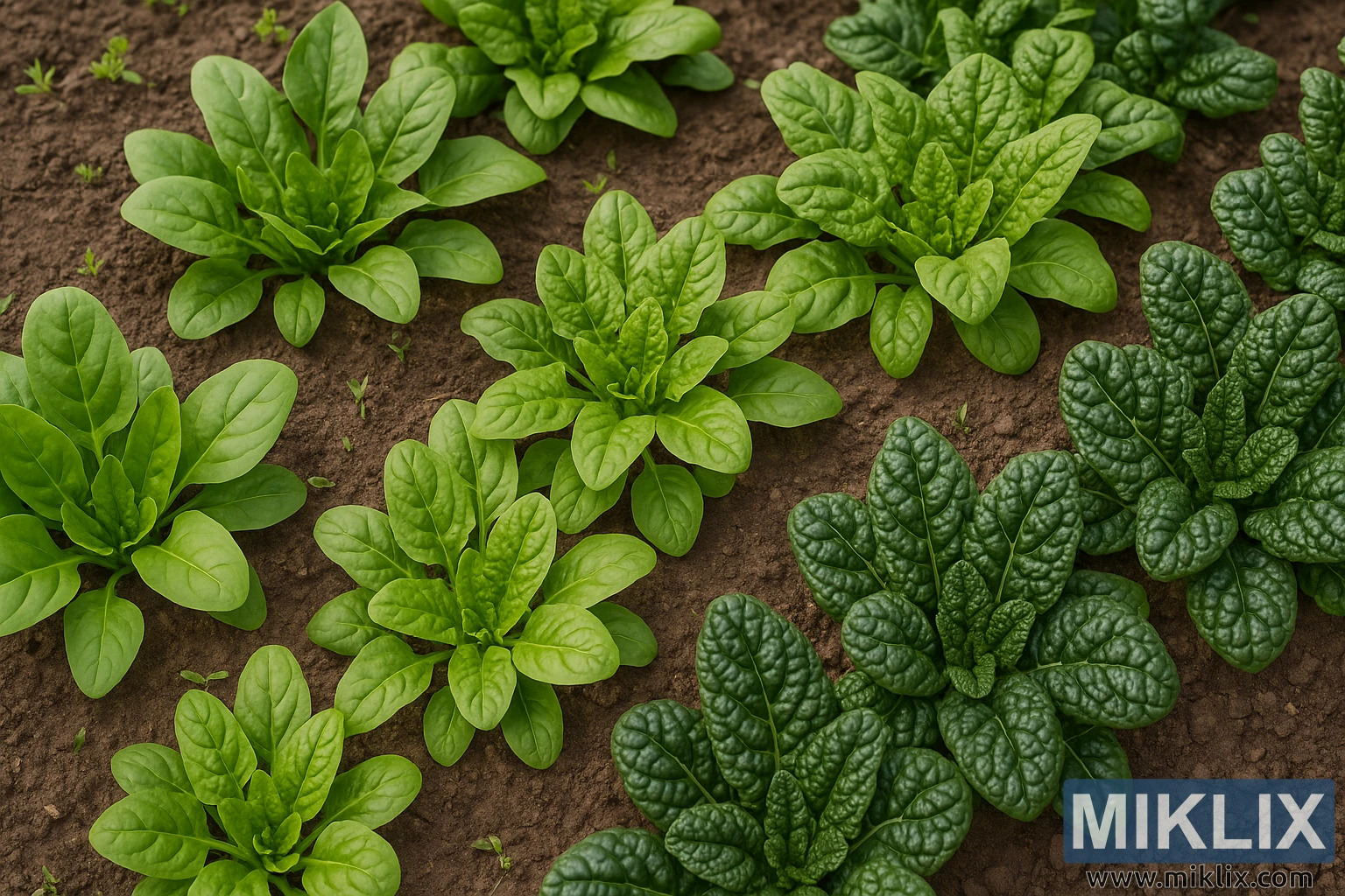 İyi bakılmış bir bahçe yatağında yetişen düz yapraklı, yarı savoy ve savoy ıspanak çeşitlerini gösteren, türler arasındaki doku ve renk farklılıklarını gösteren detaylı bir fotoğraf.