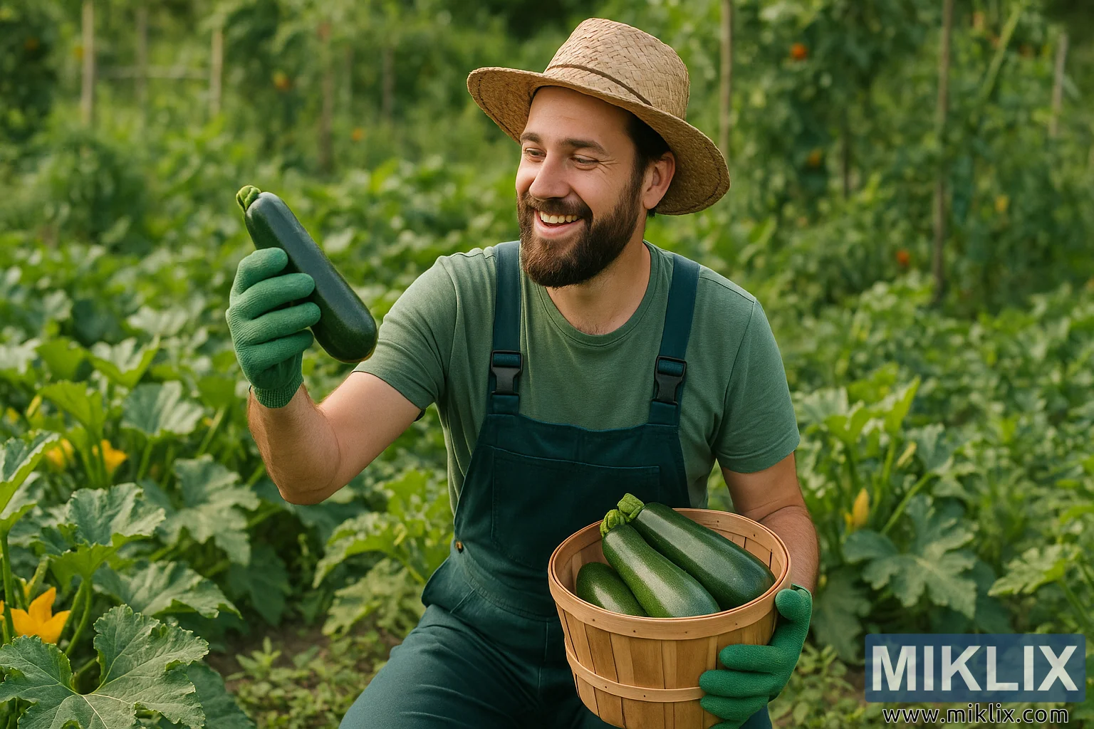 Neşeli bir bahçıvan, yemyeşil ve bereketli bir bahçede olgunlaşmış kabakları hasat ediyor ve elinde taze ürünlerle dolu bir sepet tutuyor.