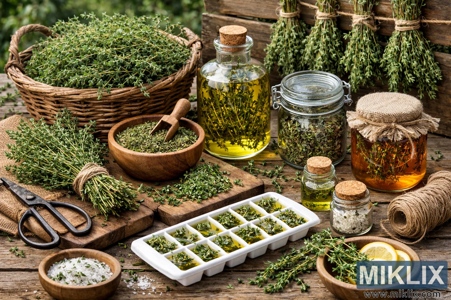 Kekik hasadını ve geleneksel ve modern yöntemler kullanılarak muhafaza edilmesini gösteren, kırsal bir natürmort resmi. Bu yöntemler arasında kurutma, yağ infüzyonu, dondurma ve bitki özlü tuz kullanımı yer alıyor.