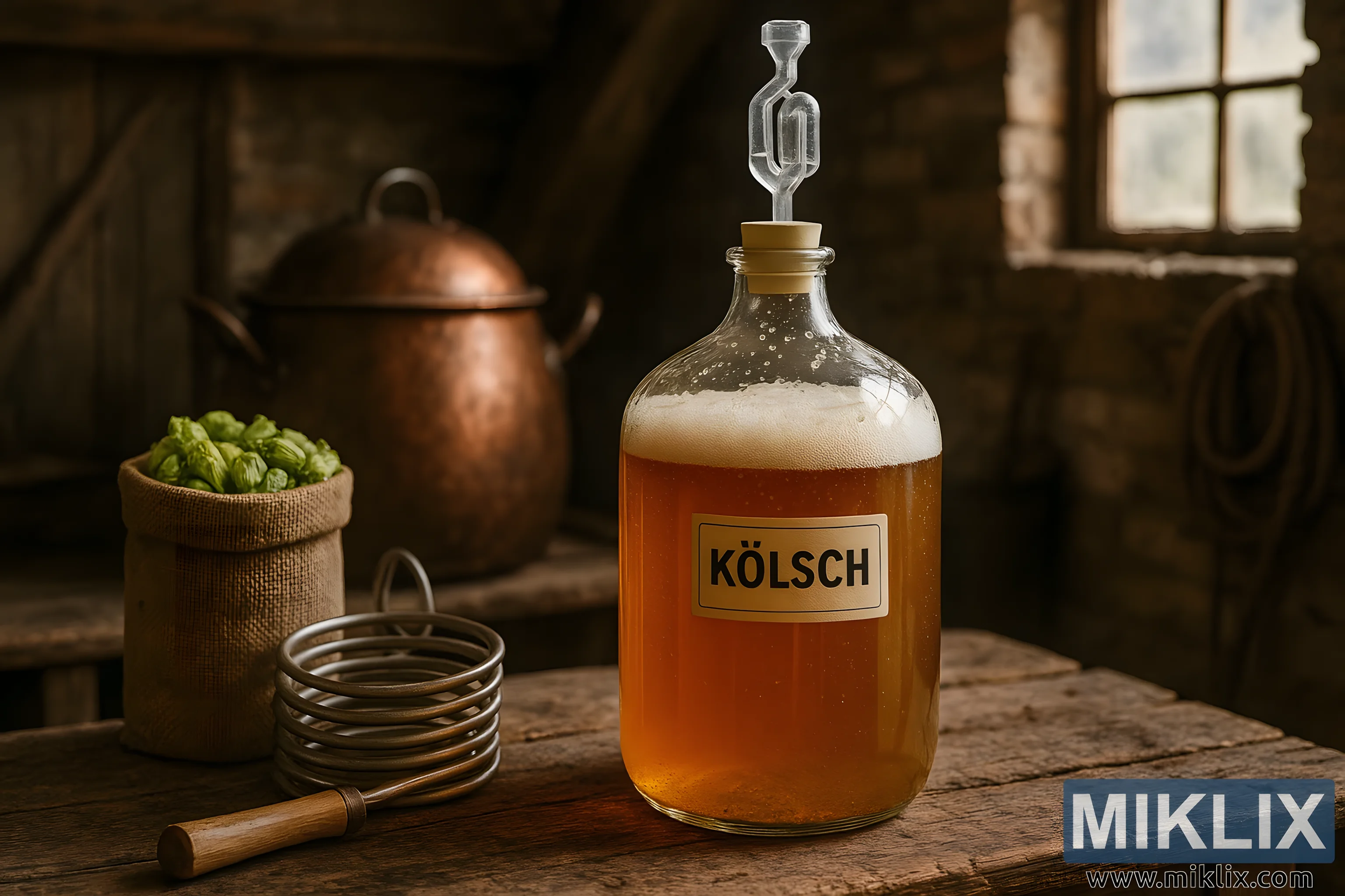 Kölsch-Style Beer Fermenting in a Rustic German Homebrew Workshop