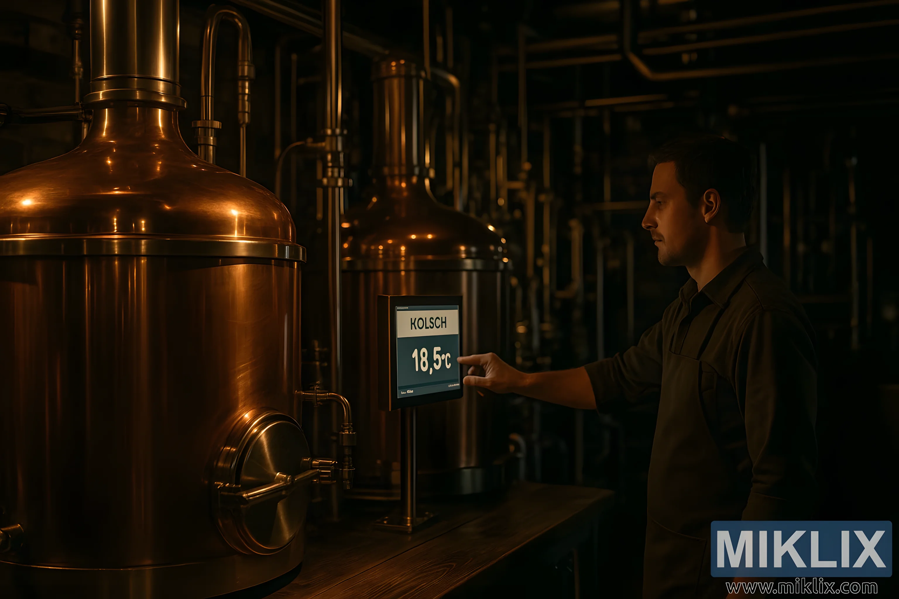 Sıcak bir şekilde aydınlatılmış bir bira fabrikasının içinde, bir teknisyen, karmaşık bir boru ve bira üretim ekipmanı ağıyla çevrili, parıldayan bakır tankların yanındaki dijital bir ekranda Kölsch fermantasyonunun kesin sıcaklığını izliyor.