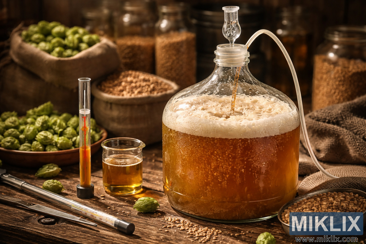 Sıcak bir butik bira fabrikası ortamında, cam damacana, köpüren maya, hava kilidi, hidrometre, şerbetçiotu ve malt tanelerinin yer aldığı aktif bir bira fermantasyon sürecinin yüksek çözünürlüklü görüntüsü.