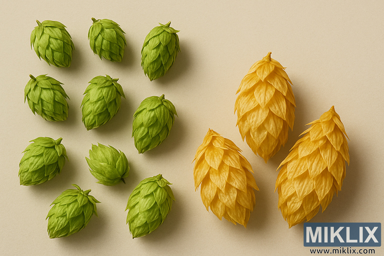 Bu görüntü, hem çeşitliliğini hem de Crystal çeşidinin benzersizliğini vurgulayan bir şekilde düzenlenmiş, şerbetçiotlarının çarpıcı ve metodik bir sunumunu yakalıyor. Nötr, krem tonlu bir arka plana yerleştirilen kozalaklar, botanik bir çalışmanın hassasiyetiyle yerleştirilmiş ve basit bir tarım ürünü olarak görülebilecek şeyleri bilimsel ve estetik takdir nesnelerine dönüştürüyor. Arka planın sadeliği, dikkat dağıtıcı hiçbir unsur olmamasını sağlayarak, izleyicinin tamamen kozalakların formuna, rengine ve dokusuna odaklanmasını sağlıyor; detayları keskin bir netlikle ve neredeyse dokunsal bir varlıkla sunuluyor.