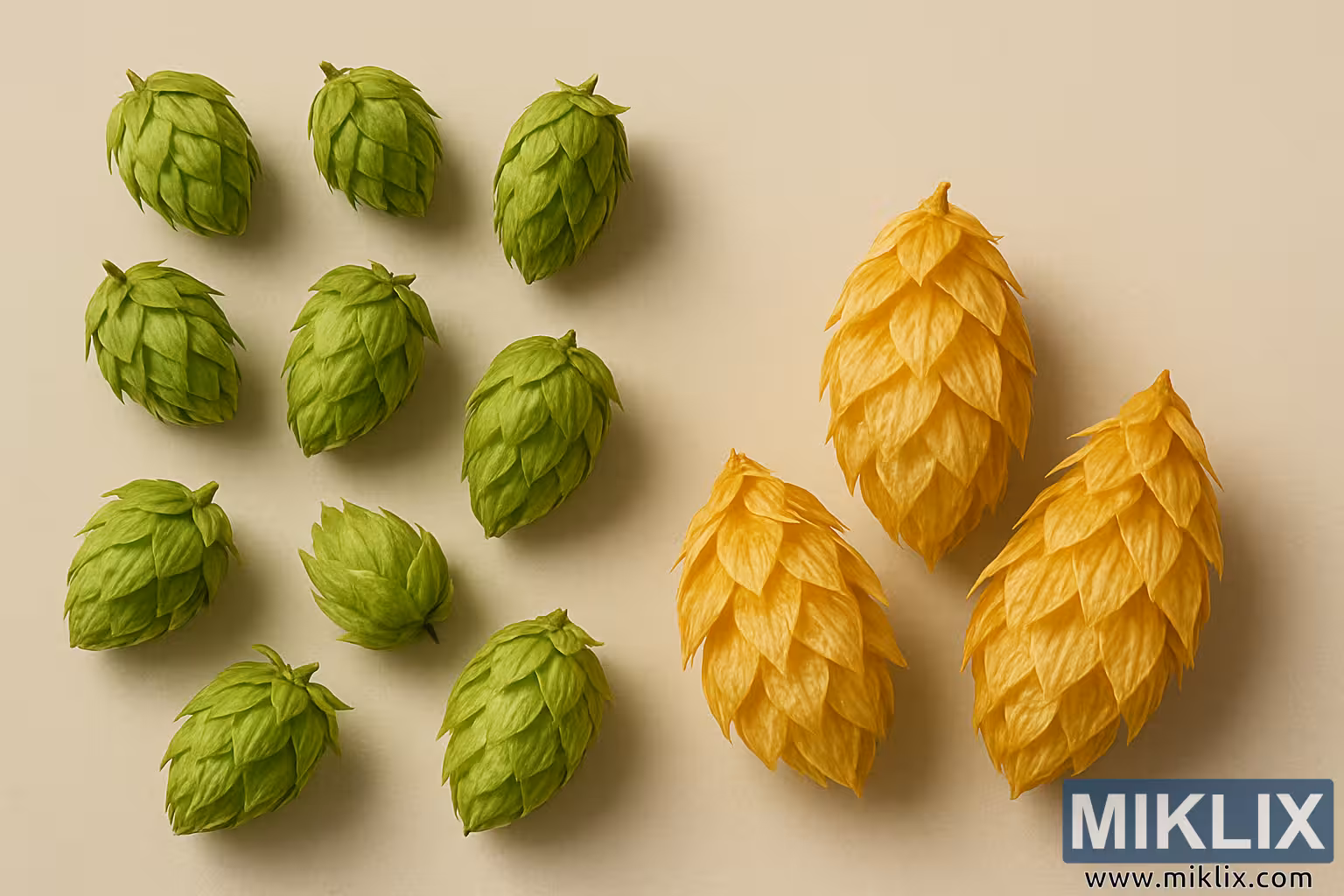 Kompozisyonun sol tarafında, çerçeve boyunca uzanan canlı yeşil şerbetçiotu kozalakları dizisi yer alıyor. Her biri, genel olarak oval bir forma sahip olsa da, boyut, koniklik ve üst üste binen braktelerin dizilimi açısından ince farklılıklar gösteriyor. Geleneksel şerbetçiotu çeşitlerinden oluşan bir seçkiye ait olan bu kozalaklar, çeşitli olgunluk aşamalarında tasvir edilmiş ve renkleri parlak bahar yeşilinden daha koyu, orman benzeri tonlara kadar uzanıyor. Yukarıdan yumuşak bir şekilde düşen yönlendirilmiş ışık, her bir taç yaprağı benzeri braktenin karmaşık katmanlarını vurgulayarak, bu botanik örneklerin yapısal zarafetini vurgulayan narin gölgeler oluşturuyor. Yeşil tazelikleri, canlılığı, reçinemsi karakteri ve bira üreticilerinin uzun zamandır maltın tatlılığını dengelemek için güvendiği keskin, aromatik acılık vaadini iletiyor.