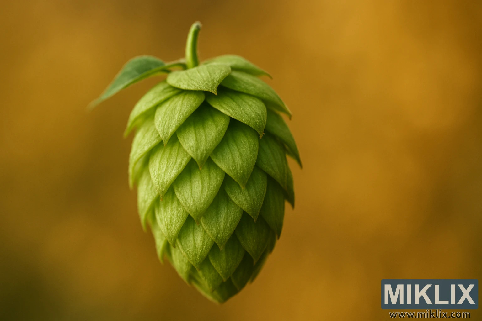 Tek bir Landhopfen şerbetçiotu konisi, yumuşak altın rengi bir bulanıklığa karşı canlı yeşil renkte parlayarak, bira yapımında geleneği ve zanaatkarlığı sembolize ediyor.