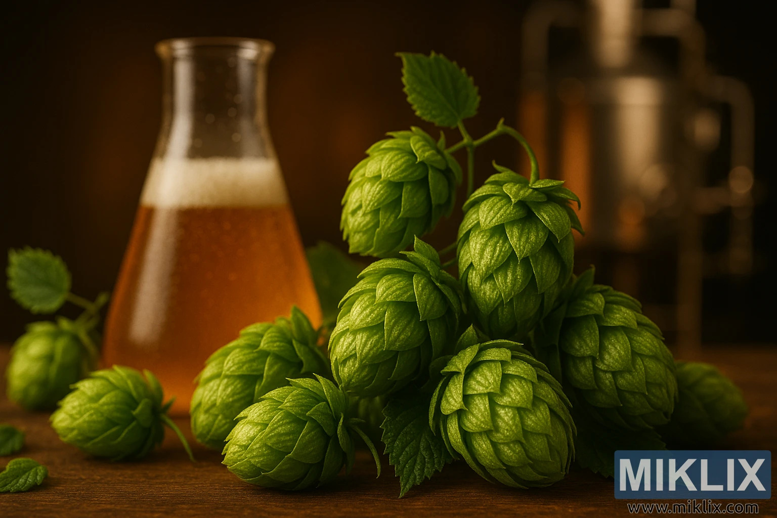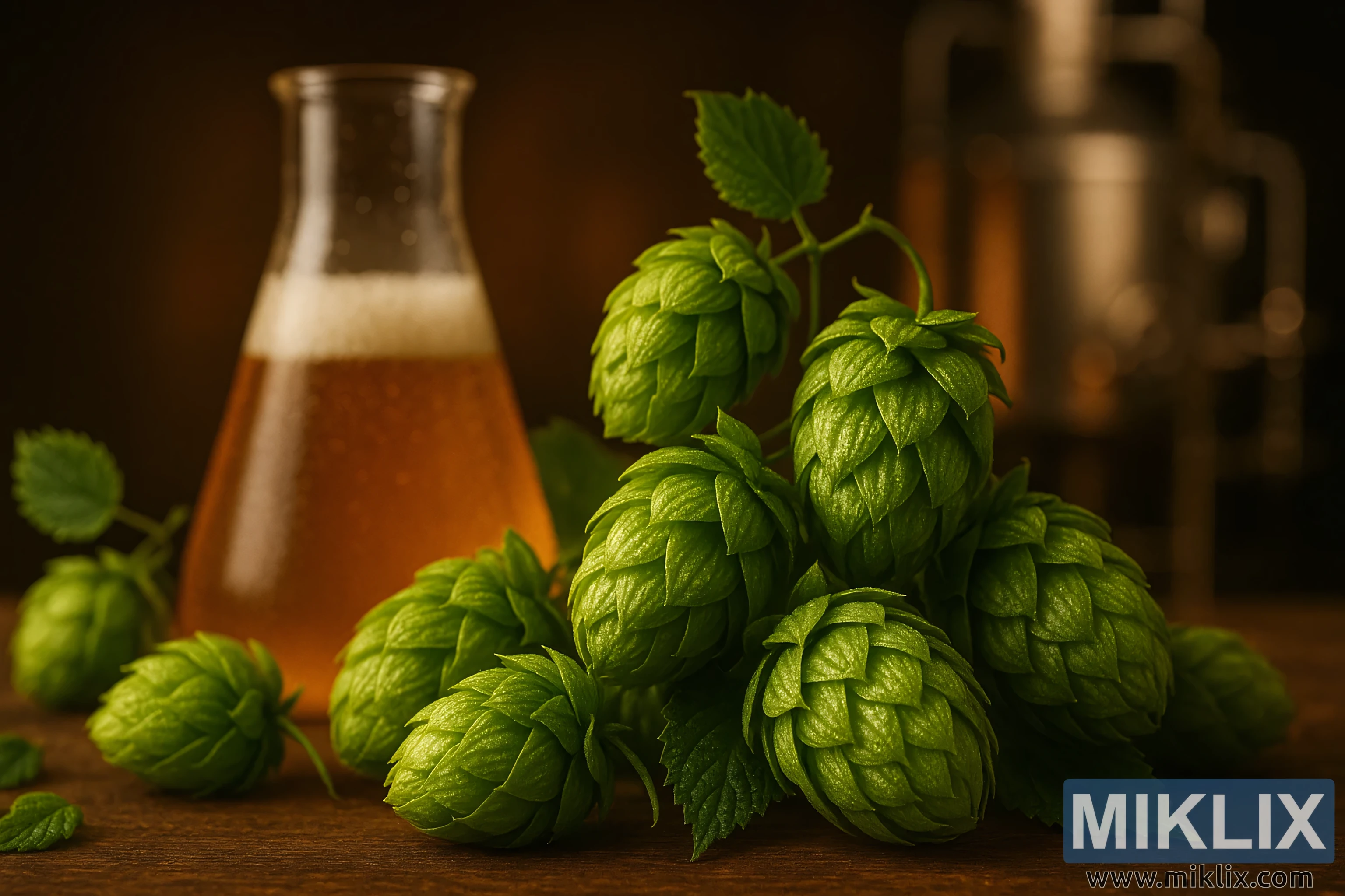 Taze Zenith şerbetçiotları sıcak ışık altında parıldıyor, altın rengi bira bardağı ve demleme düzeneği ise zanaat birası üretimindeki hayati rollerini vurguluyor.