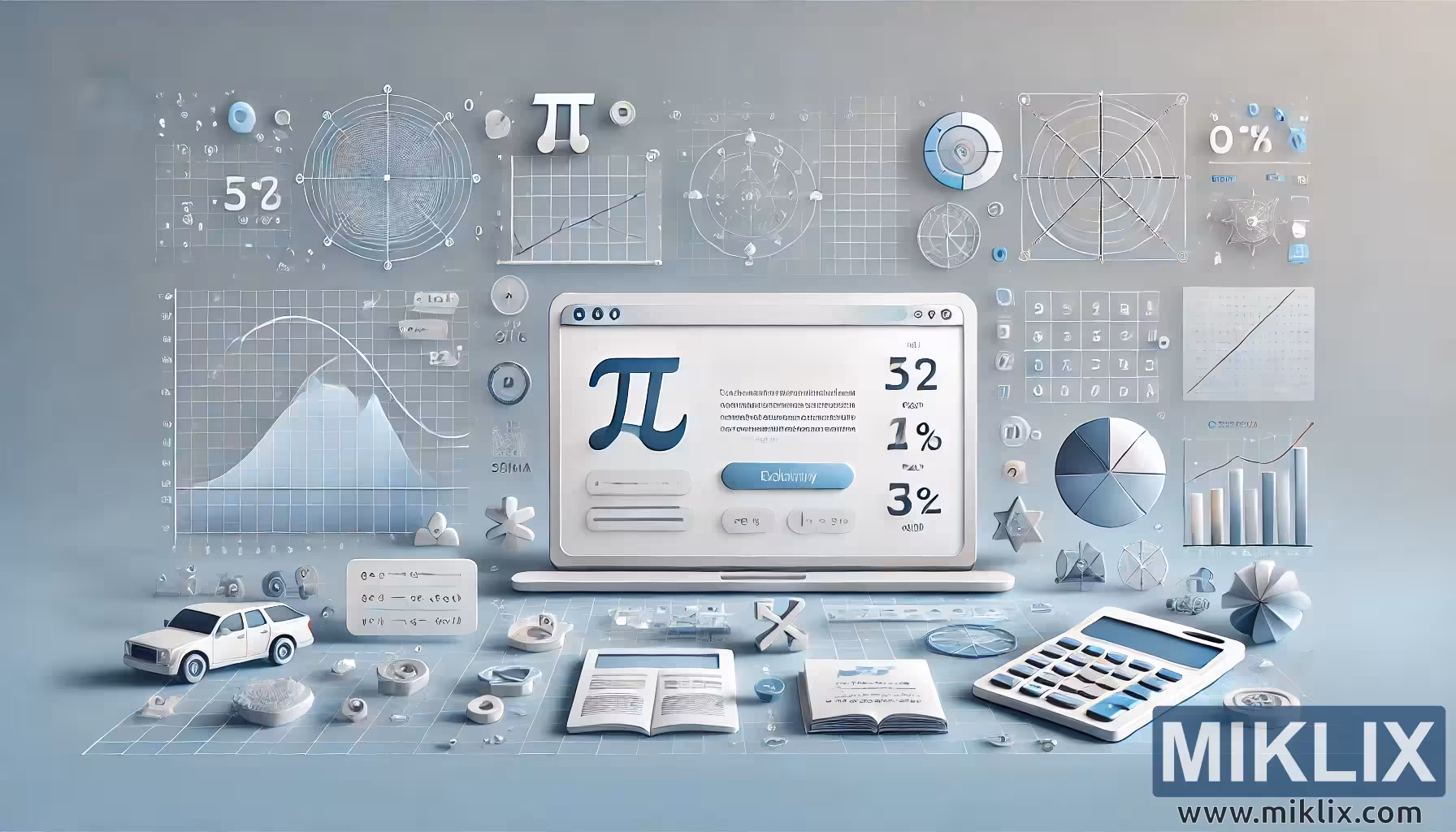 Bu dijital çizim, çevrimiçi hesap makineleri ve matematiksel araçlar kavramını modern ve soyut bir tarzda tasvir ediyor. Ortada, π (pi) matematik sembolünün yanı sıra, dijital platformların hesaplamalar yapmak için kullanımını simgeleyen sayısal veriler ve formüllerin yer aldığı büyük bir dizüstü bilgisayar ekranı bulunuyor. Dizüstü bilgisayarı çevreleyen çok sayıda grafik, çizelge ve matematiksel diyagram bulunuyor. Bunlar arasında pasta grafikleri, çubuk grafikler, kutupsal koordinat sistemleri ve çizilen eğriler yer alıyor. Bunlar, temel aritmetikten ileri istatistiksel ve bilimsel uygulamalara kadar çevrimiçi hesap makinelerinin çeşitli işlevlerini temsil ediyor. Açık bir kitap, hesap makinesi ve geometrik modeller gibi nesneler, eğitimsel ve teknik yönü vurgulayarak bu araçların öğrencilere, profesyonellere ve araştırmacılara nasıl yardımcı olduğunu vurguluyor. Oyuncak benzeri bir araba ve dağınık sayısal öğeler, pratik, gerçek dünya problem çözme uygulamalarını güçlendirirken bir soyutlama dokunuşu katıyor. Yumuşak mavi-gri renk paleti, web tabanlı hesap makinelerinin erişilebilirliğini, hassasiyetini ve verimliliğini simgeleyen temiz ve fütüristik bir ton yaratıyor.