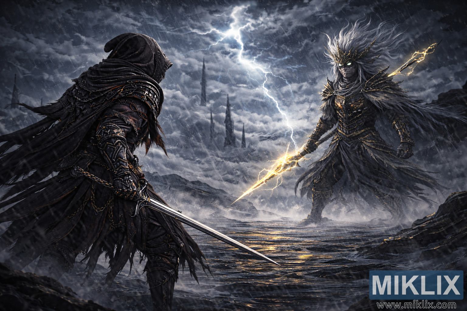 Karanlık fantastik bir anime tarzında çizilmiş, kapüşonlu bir savaşçının gölge zırhı içinde, ölümsüz bir şimşek kralıyla karşı karşıya geldiği, gök gürültüsü, yağmur ve yıkılmış kulelerin arasında geçen savaş öncesi sahneyi gösteren sinematik bir illüstrasyon.